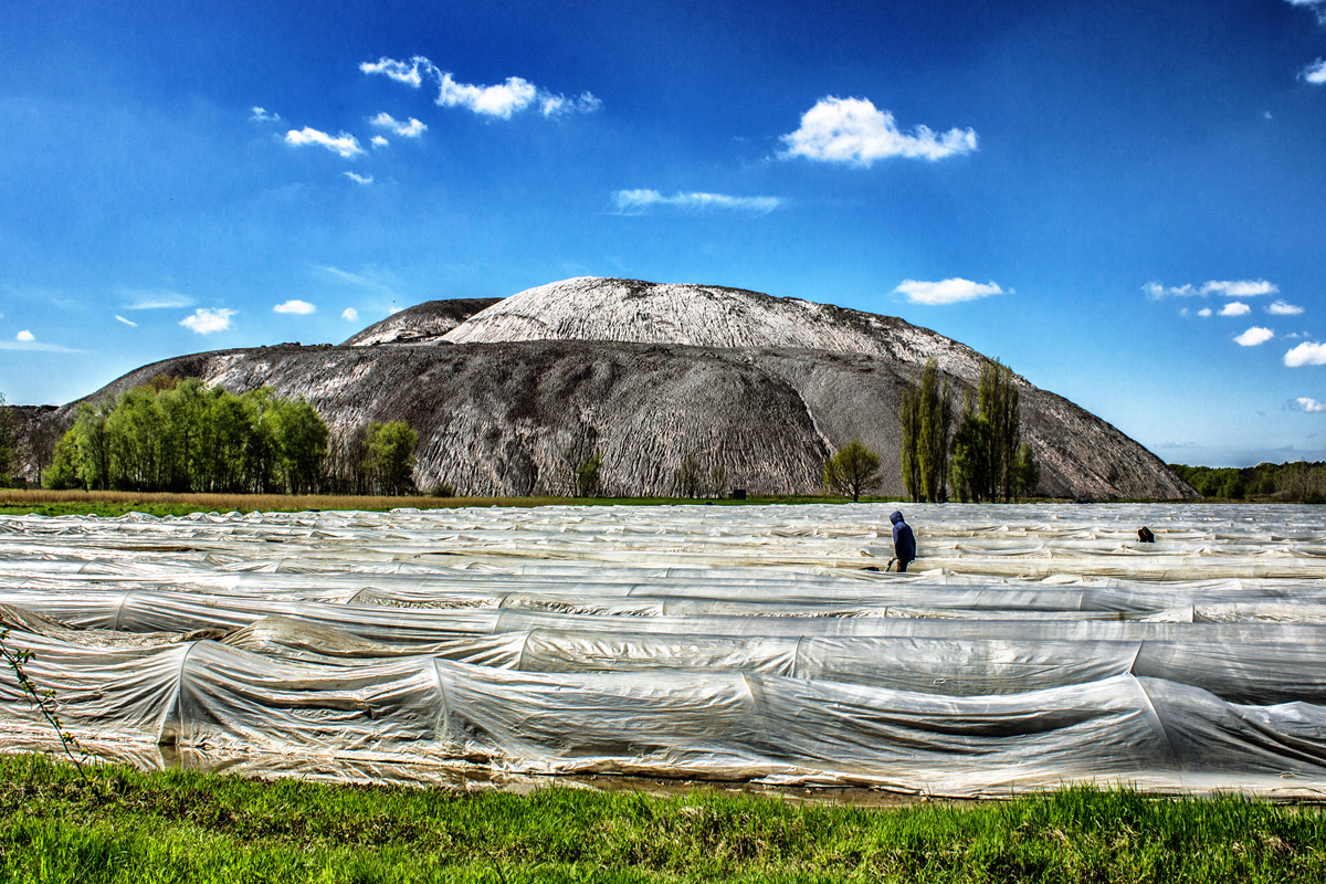 Spargelernte neben der Rückstandshalde des ehemaligen Kaliwerks "Niedersachsen" in Wathlingen (LK Celle) - Mit 22,4 Mio. Tonnen und 30.000 m³ an sonstigen Abfällen) ist sie die "Nr. 3" in Niedersachsen (nach Hugo/Sehnde und Sigmundshall/Bokeloh). Eine Abdeckung mit Bauschutt und anschließende "Begrünung" bis 2045 ist geplant ...