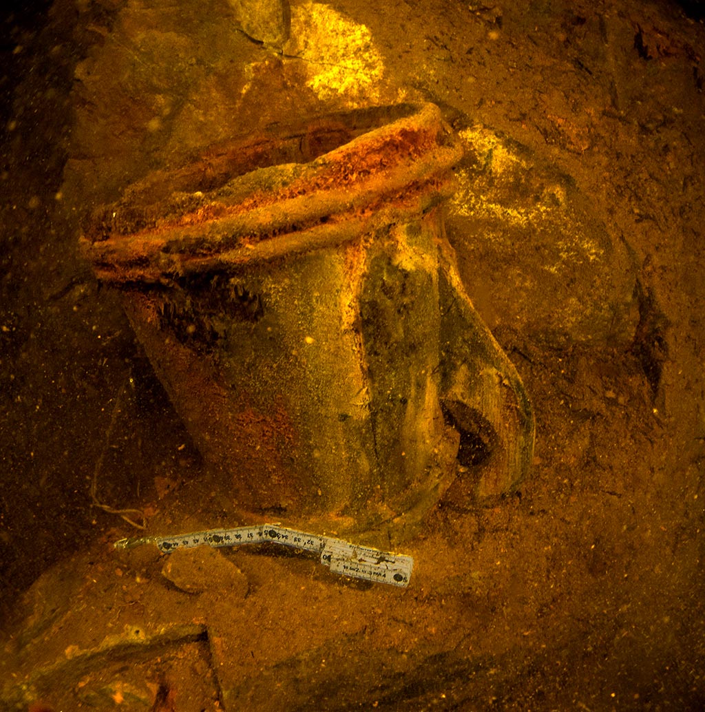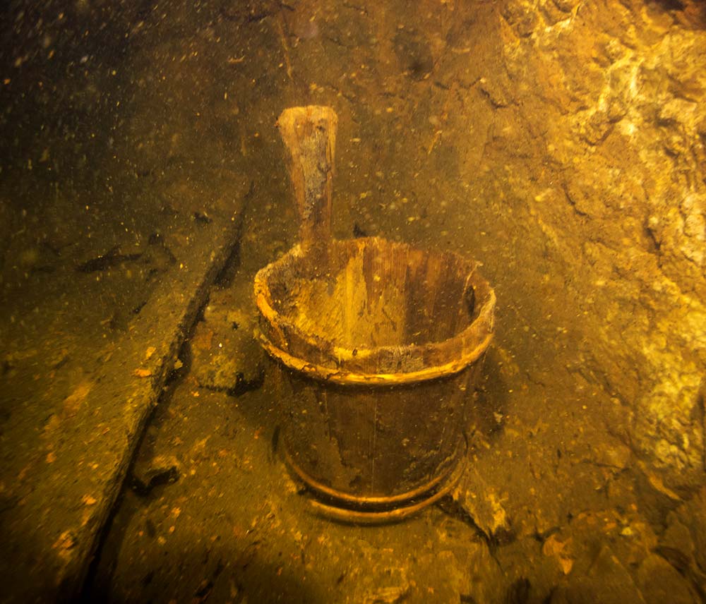 Die beigefügten Fotos zeigen ein beständig abgesoffenes Bergwerk im Osterzgebirge. Näheres möchte ich vorerst nicht mitteilen. Ich durfte auf Anfrage hier zwei Mal tauchen und schon auf dem ersten Video fiel ein rundliches Gefäß auf, das beim 2. TG näher begutachtet werden sollte. Man muss dazu sagen, dieses Bergwerk ist aus dem 16. Jh. und später lange Jahre verschüttet gewesen, also nicht mehr überformt, sehr wilder Bergbau. Die Vermutung lag also nahe, dass es sich nicht um einen neuzeitlichen Eimer aus dem Baumarkt handelt, den schludriges Aufwältigungspersonal vergessen hatte.