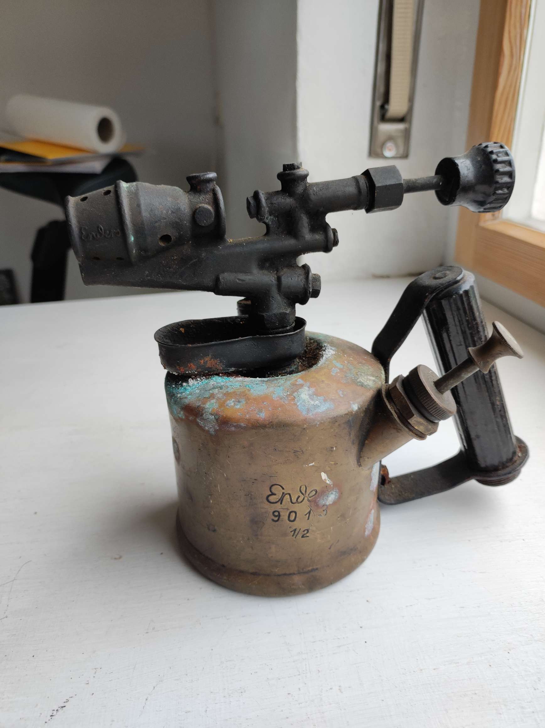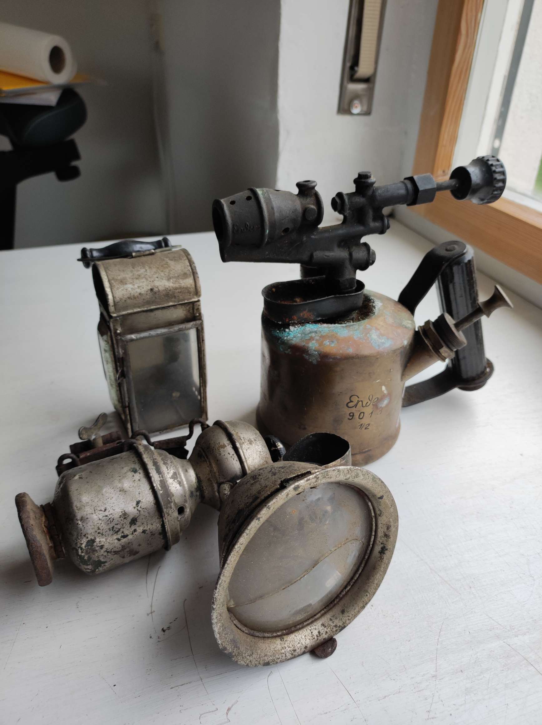 Das eine ist eine normale alte Lötlampe (mit Benzin betrieben) wie sie früher auch zum Löten von Dachrinnen u.ä. verwendet wurde. Mein Großvater war Kupferschmied und hatte solche Lampen.