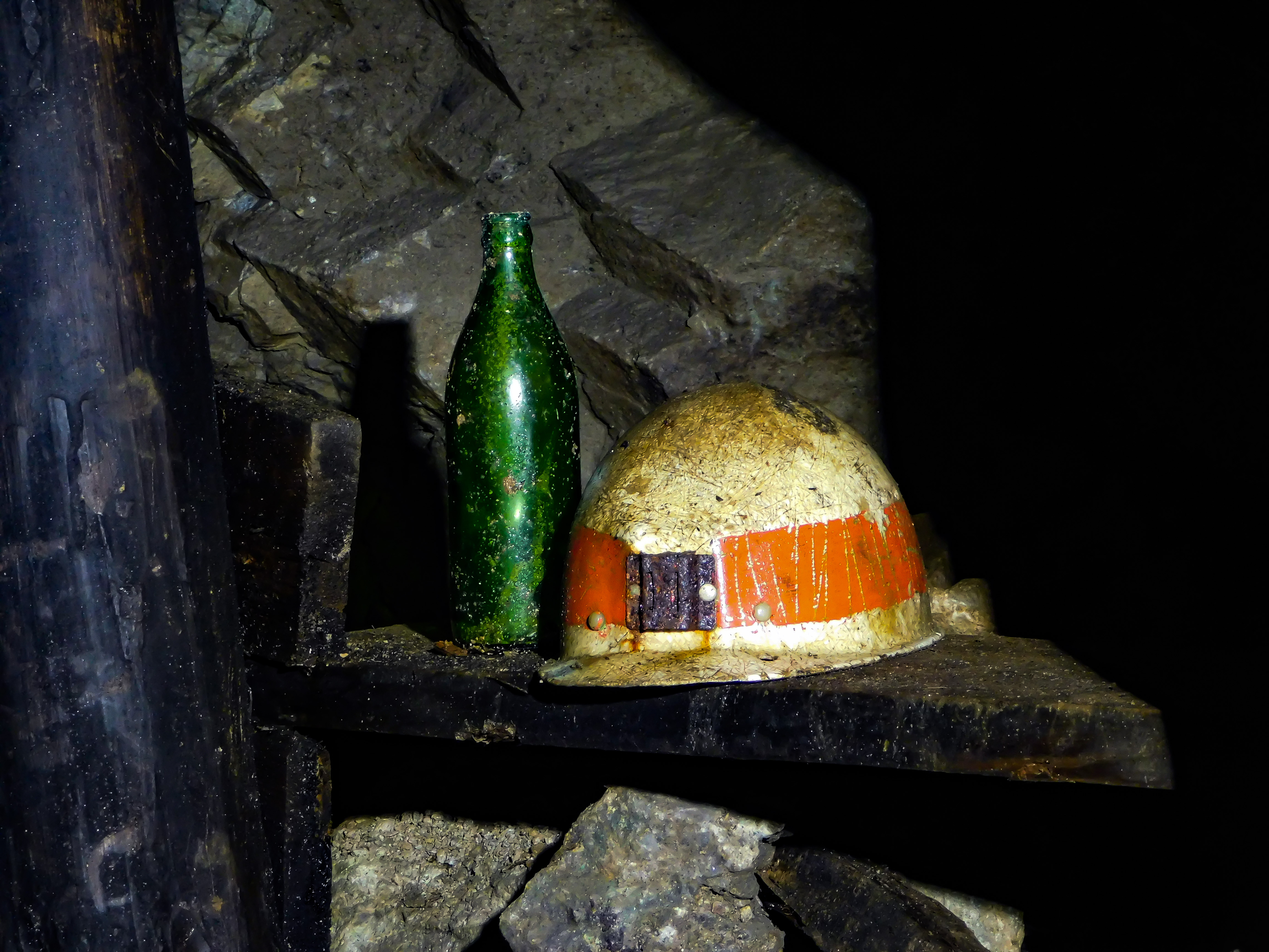 Nachstellung einer Situation am Lohntag im Annaberger Wismutobjekt 04. Aufgrund herumfliegender Gläser blieb der Helm auf.