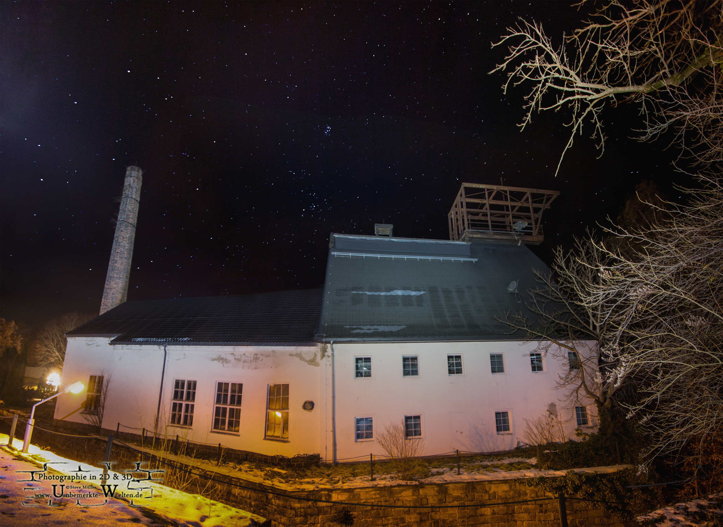 Der Einigkeitschacht der Grube Alten Hoffnung Gottes in Kleinvoigtsberg unter Sternenhimmel.