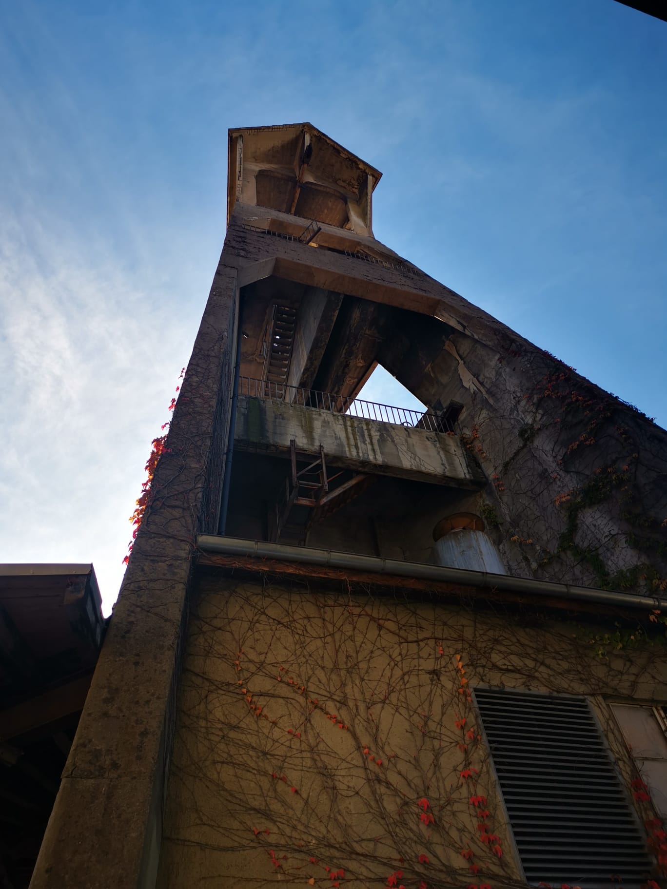 Der 1934 in Stahlbetonbauweise nach den Plänen des Architekten Fritz Schupp (war auch an der Planung der Zeche Zollverein in Essen beteiligt) erstellte Förderturm des Klenzeschachtes