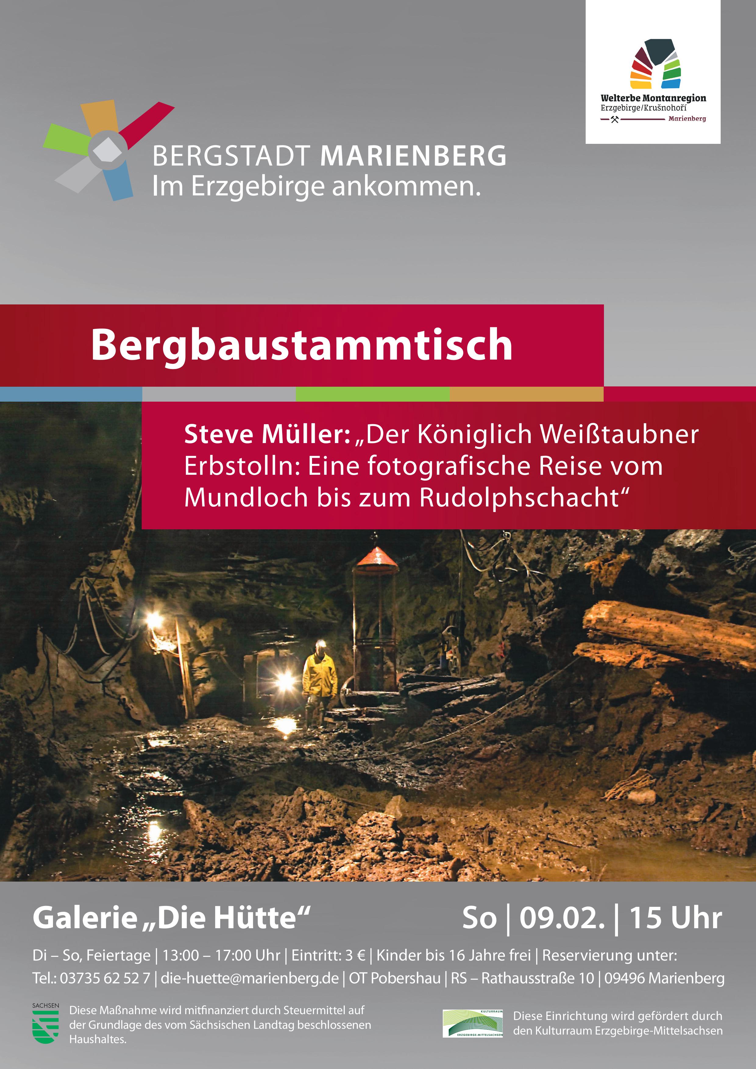 Steve Müller: „Der Königlich Weißtaubner Erbstolln: Eine fotografische Reise vom Mundloch bis zum Rudolphschacht“ Wo einst die Bergleute jahrhundertelang ihre schwere Arbeit verrichteten, hat sich bis heute eine faszinierende Welt erhalten. Tief im Berg liegen die Zeugen der großen Bergbaugeschichte und erzählen vom Reichtum unserer Region. Oft sind solche geschichtsträchtigen Orte nur sehr schwer zugänglich. Steve Müller nimmt uns mit auf eine fotografische Reise durch einen der größten und wichtigsten wasserabführenden Stolln des ehemaligen Marienberger Bergbaureviers.