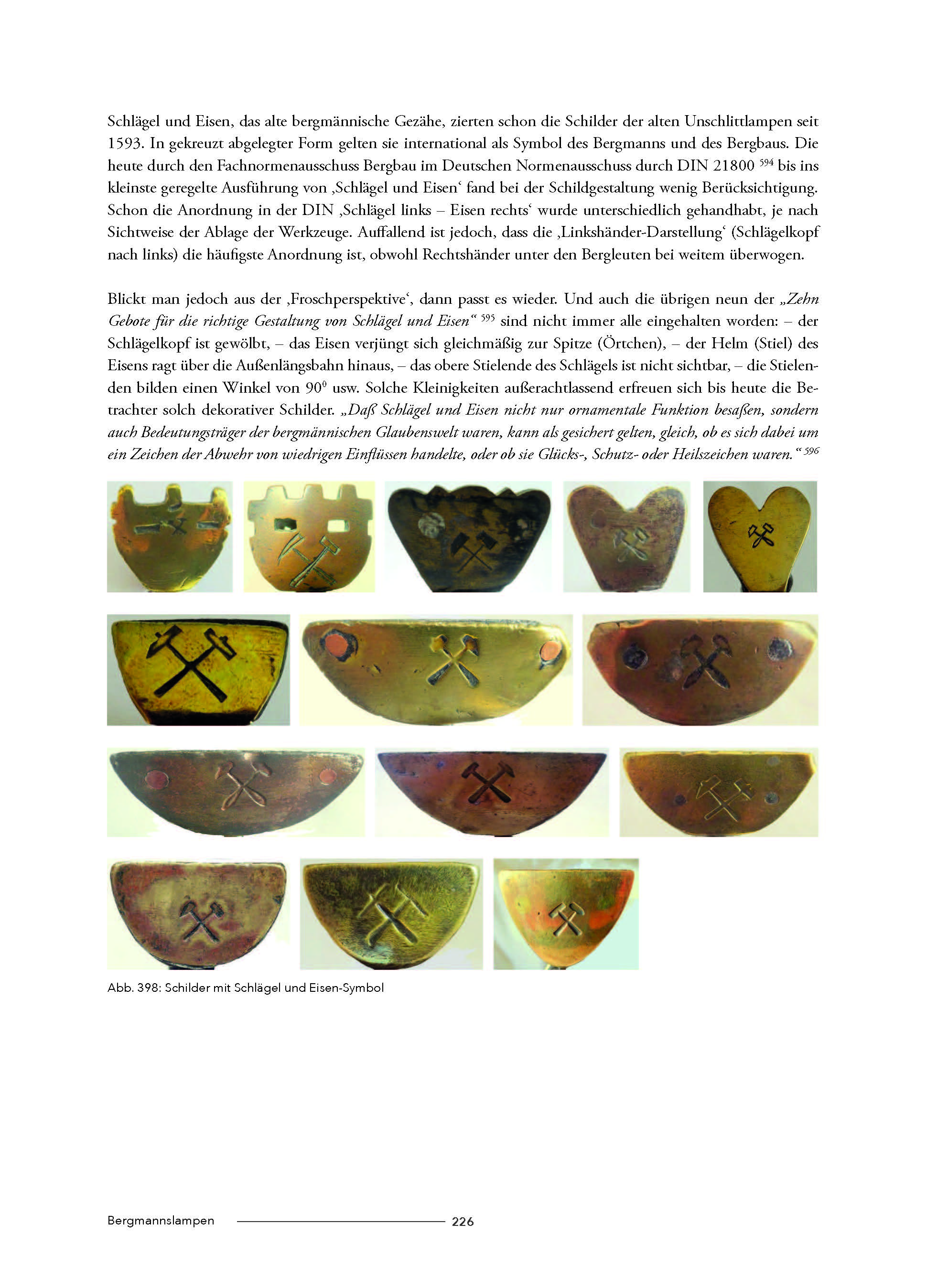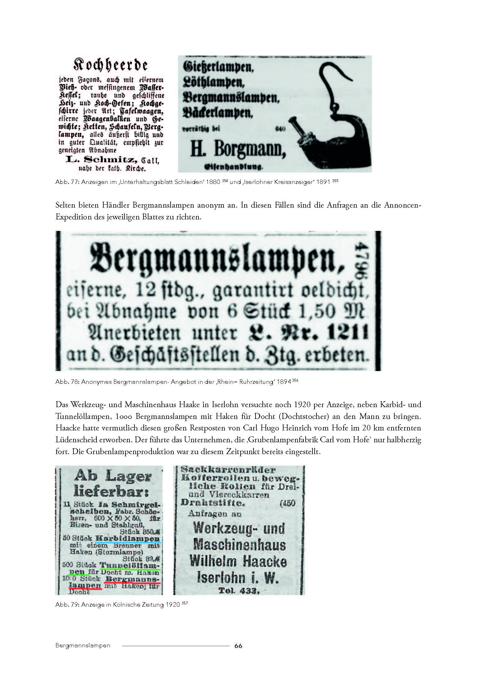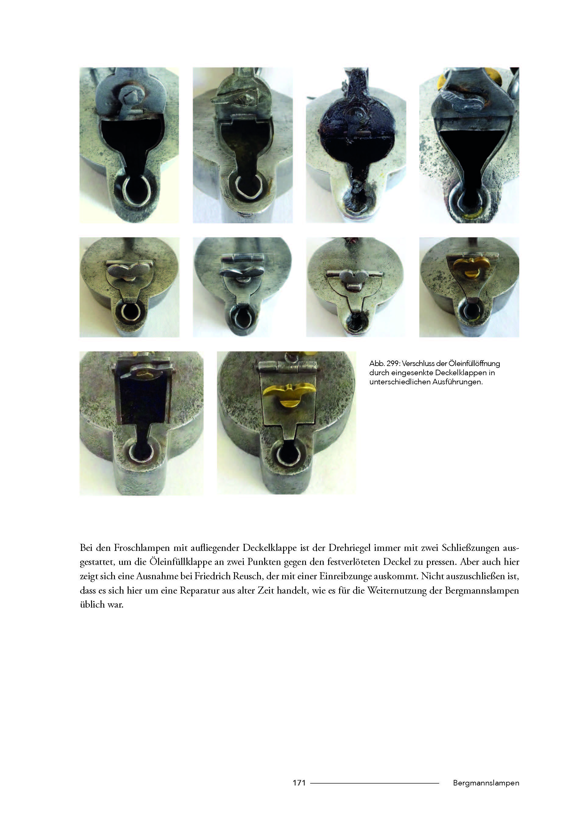 Das Kapitel ‚Erinnerungskultur an die Bergmannslampe‘ beleuchtet ausführlich das Weiterleben der Froschlampe nach dem historischen Gebrauchszeitraum und nach dem Wechsel zu moderneren Beleuchtungsformen im Bergbau. Den Abschluss der Studie bilden eine Bildergalerie mit Typologie sowie zeitlicher Einordnung der verschiedenen Bauformen westfälischer Bergmannslampen und ein umfangreicher Anmerkungsapparat mit Quellenangaben, der aus Gründen der besseren Lesbarkeit des Haupttextes ans Ende gestellt wurde und Interessierten ermöglicht, sich weitergehende Informationen in den Referenzen zu erschließen.