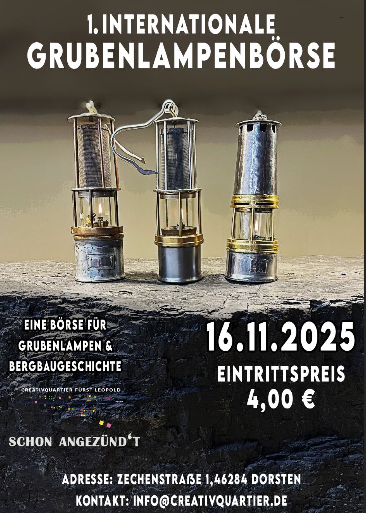 Die traditionelle internationale Grubenlampen-Herbstbörse „Schon angezünd’t“ wird in diesem Jahr erstmalig in der ehemaligen Waschkaue der Zeche Fürst Leopold in Dorsten stattfinden (Zechenstraße 1, 46284 Dorsten, Webseite des CreativQuartiers Fürst Leopold: https://www.creativquartier-fuerst-leop ... ntlocation).