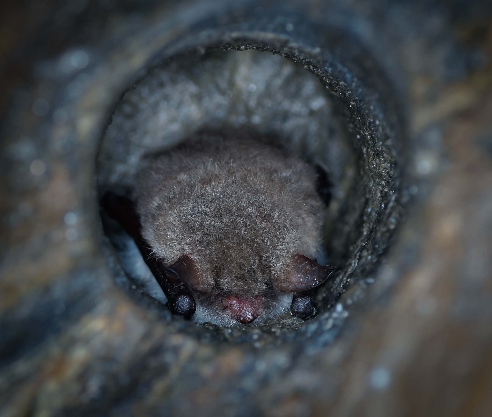 Fransenfledermaus (selten !) in einem Bohrloch Zugang zur Quarzzeche. Besucherbergwerk Sankt Anna am Freudenstein Zschorlau