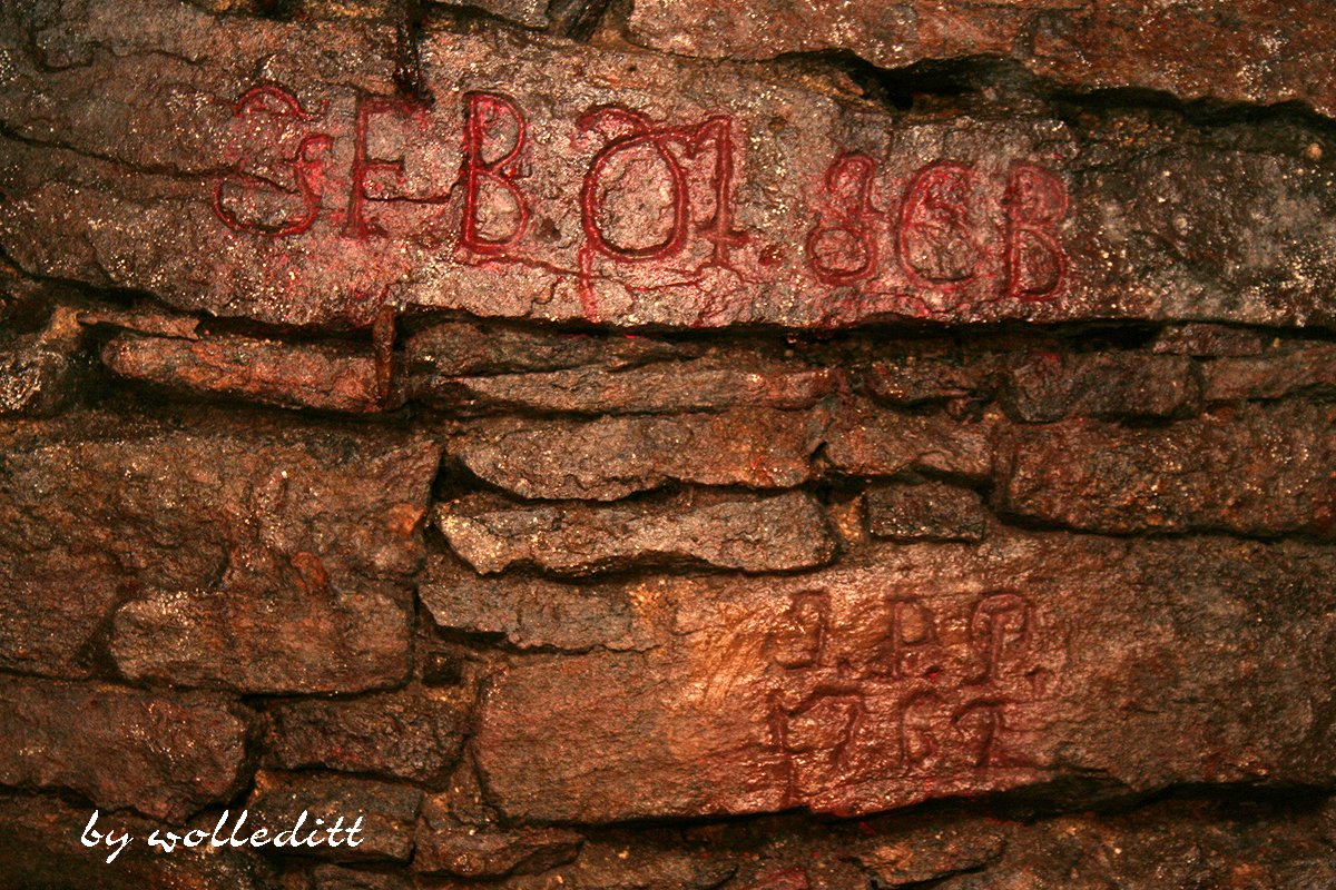 Bei der unteren Inschrift könnte es sich um ein (einfaches Freiberger) Gedingezeichen handeln, gefolgt von einer Lachterzahl. Schau mal hier: https://www.untertage.com/publikationen/25-zeichen-tafeln-inschriften-im-bergbau/126-1-gedinge-und-vortriebszeichen-jahrestafeln-vortriebstafeln.html Danke f...