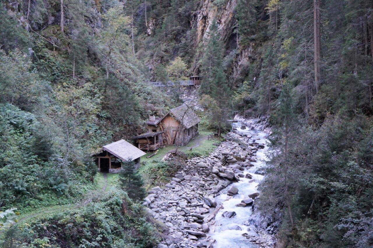 Bergwerk Hochfeld, Schachthaus (Mitte) und Mundloch mit Hängebrücke über den Sulzbach.