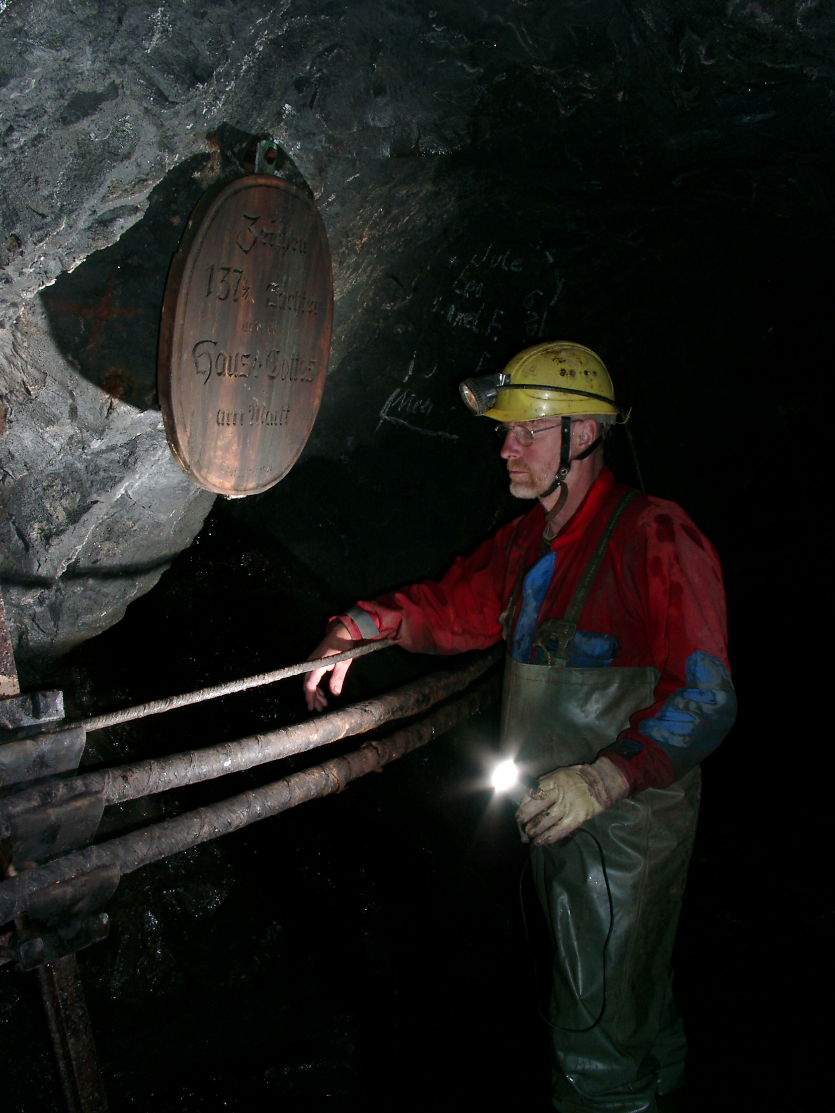Der Förderstollen diente dazu das gewonne Erz aus dem Tagebau in die Aufbereitung zu bringen. Jede Menge Ocker ist da durch die Befahrung mobilisiert.
