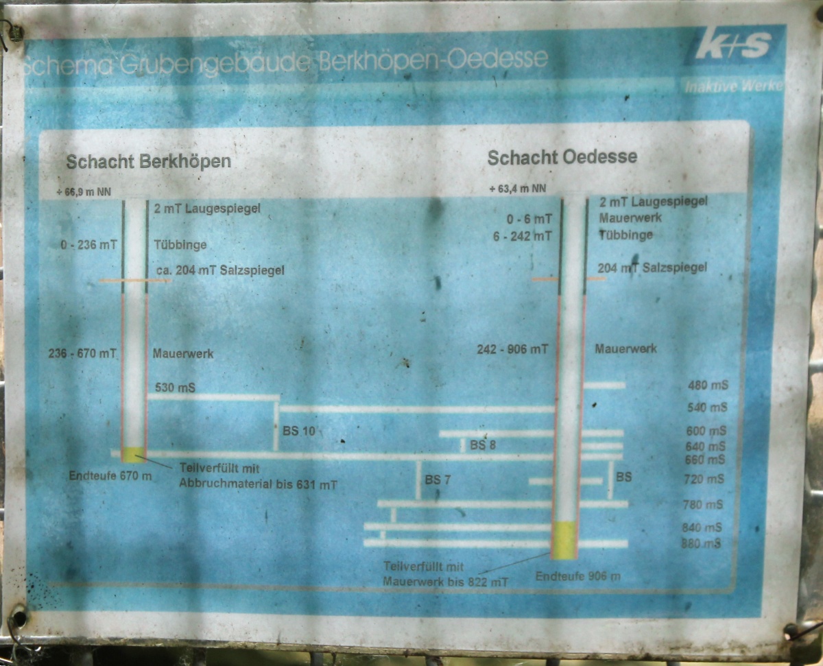 Leider kamen wir nicht dazu, den Schacht Berkhöpen anzuschauen, das hätte das Ganze abgerundet, obwohl dort momentan wohl nur die Arbeitsbühne zu sehen ist. Interessant ist auch die Geschichte mit dem Abgang der Versatzsäule, die auch in dem Artikel der PAZ dokumentiert ist. Es ist von 40 m die Rede, die Aufsicht am Schacht Berkhöpen hat einen starken Luftzug wahrgenommen und daraufhin sofort Schacht Oedesse befahren. Dort stand ringsum alles unter Wasser, und der Betondeckel war verschoben, wie man das auch auf meinem Foto sehen kann. Dirk Reppert hat die Teufe genannt, mir ist aber die Zahl entfallen, bei der der Übergang von Sole zu Süßwasser stand. Es war aber auf jeden Fall im Bereich des Salzspiegels, d.h. es standen nicht ganz 200 m Süßwasser obendrauf. Sonst wäre das Salzbiotop jetzt etwas größer.