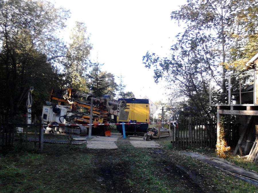 Ein Bild von gestern. Ca. 20m neben dem altem Schacht. Man hat bei der Bohrung einen kleineren Hohlraum gefunden und verfüllt. Weiter unten an der Uranushalde hat man wohl einen größeren Höhlraum entdeckt. Habe aber keine info wie da verfahren wurde oder wird. Weiß jemand näheres?