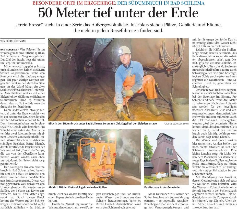 Die Wismut GmbH fährt im Rahmen der Sanierung einen neuen Grubenbau auf. Mit den Arbeiten am sogenannten „Südumbruch“ wird ab sofort begonnen. Der neue Grubenbau dient der Ableitung von bergbaulichen Wässern. Der „Südumbruch“ wird mit einer Länge von 980 m neu aufgefahren und auf einer Länge von 210 m ein bereits vorhandener Grubenbau nachgerissen. Der Südumbruch bildet somit auf ca. 1,2 km eine neue Teilstrecke des Markus-Semmler-Stollens. Die Auffahrung erfolgt südlich des ehemaligen Deformationsgebietes und damit außerhalb des bergbau- und flutungsbedingten Senkungstroges Oberschlema.