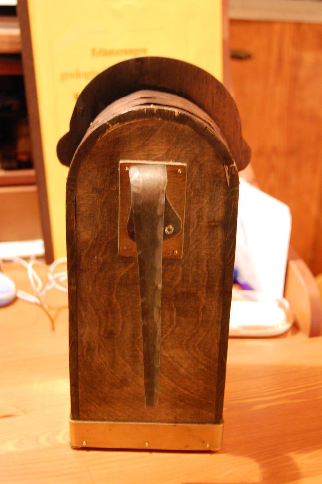 Sperrholz, 3 mm, einfach in kochendes Wasser stecken und dann um eine Form (zwei Bretter nach Maß auf Abstand gehalten) biegen. Rückwand 10 mm Holz.