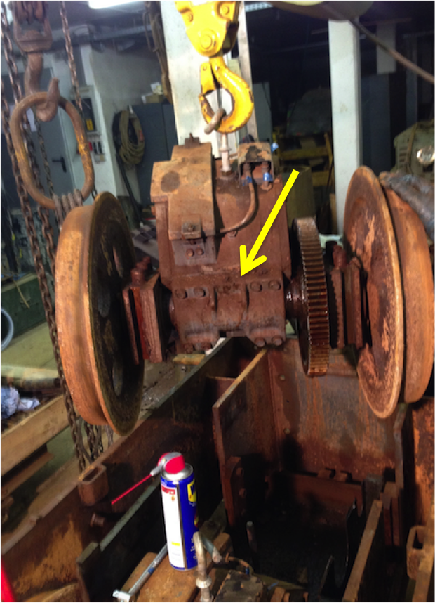 Hier ein Antrieb mit Achse. Der Pfeil zeigt auf die Schmierstelle.