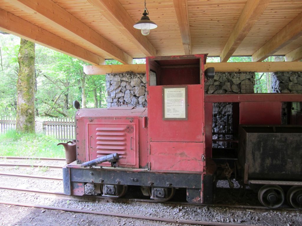 Und weils gerad so schön ist hier auch noch unsere NS 1 Feldbahn- Lok im Übertagebahnhof (Die Ölkanne ist für das Wassernachfüllen des Wasserbehälters auf unserer EL 9). Bitte nicht wundern 2 von 3 Fahrspuren werden als überdachtes Abstellgleis für unsere Förderwagen (für Personeneinfahrt auf Wunsch bei angemeldeten Gruppen/ ähnlich wie bei Indiana Jones, nur mit Akkulok davor), die Original- Pesonenwagen (wie Sie bis 1990 ua. im Mansfelder Kupferschieferbegbau im Einsatz waren) und unserem Gleisbiegewagen genutzt.