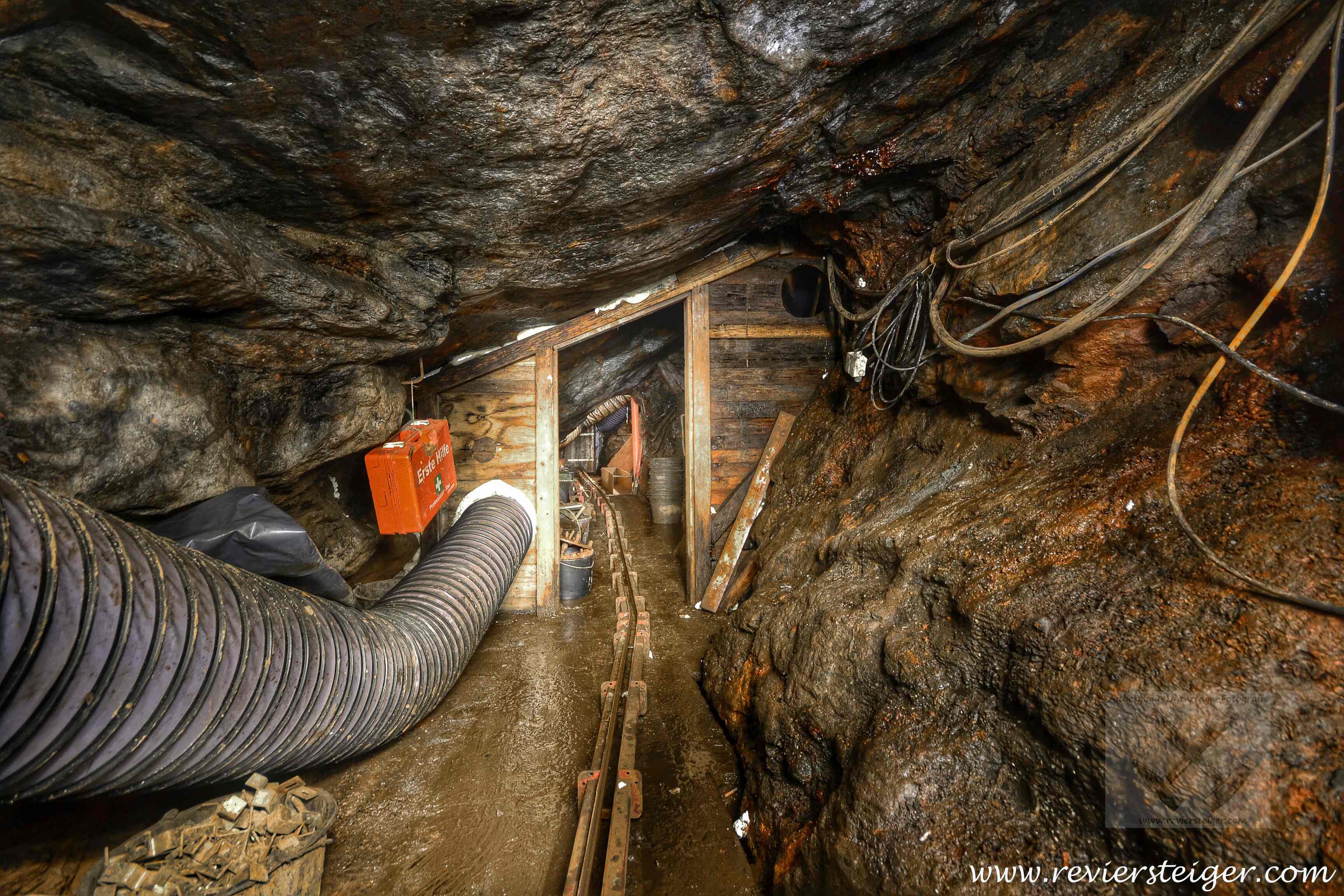Sanierungsarbeiten mit Einschienenbahn auf dem Königlichen Weißtaubner Tiefen Erbstolln auf Höhe der Fabian-Sebastian Fundgrube, Marienberg i. sächsischen Erzgebirge, 2014