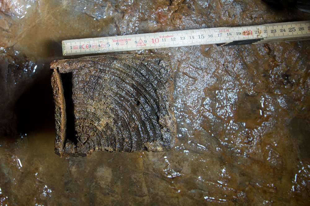 Ich kann zum Verwendungszweck dieser Kiste keine sicheren Informationen geben. Die vergleichbar großen Holzbehälter, die meine Freunde und ich vor Jahrzehnten im Alten Mann gefunden haben, waren immer Bohrtröge ohne Deckel gewesen und haben ursprünglich den Lettenbesatz oder Wasser enthalten. Das Wasser diente beim Bohren nach unten zur Befeuchtung des Bohrkleins, führte durch das Befeuchten zu einer breiigen Masse und ließ sich dadurch durch den Krätzer leichter entfernen.