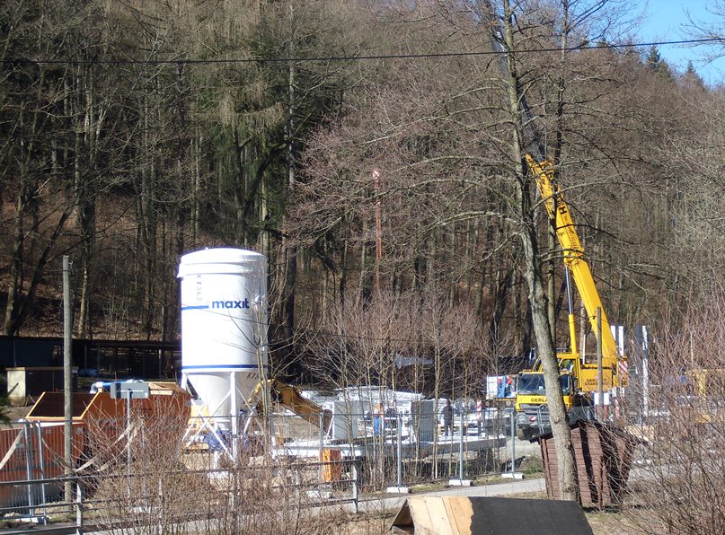 Rechts hinter dem Kran die senkrecht stehenden Stahlträger könnten schon zum vorgesehenen Förderturm gehören...