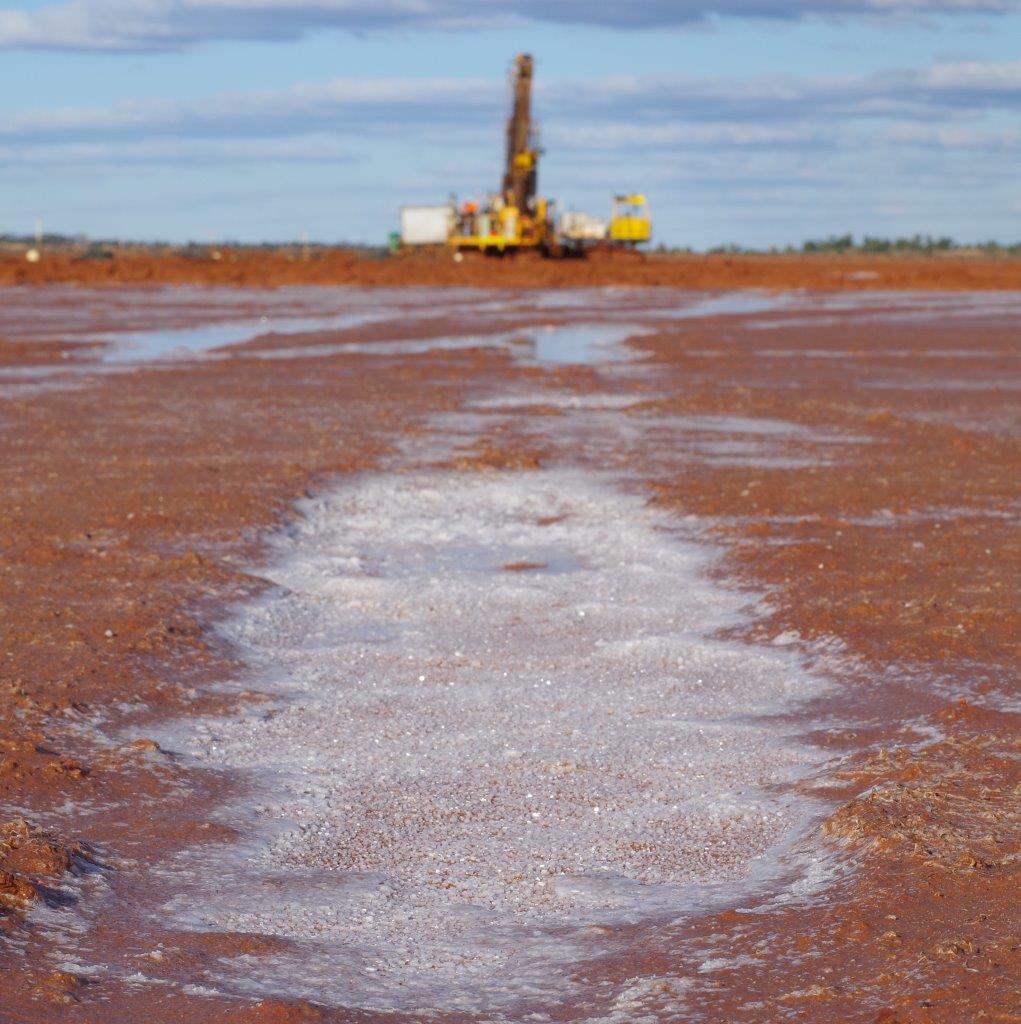 Salz auf einer Pfuetze des Lake Roe mit Diamantbohranlage im Hintergrund, WA.