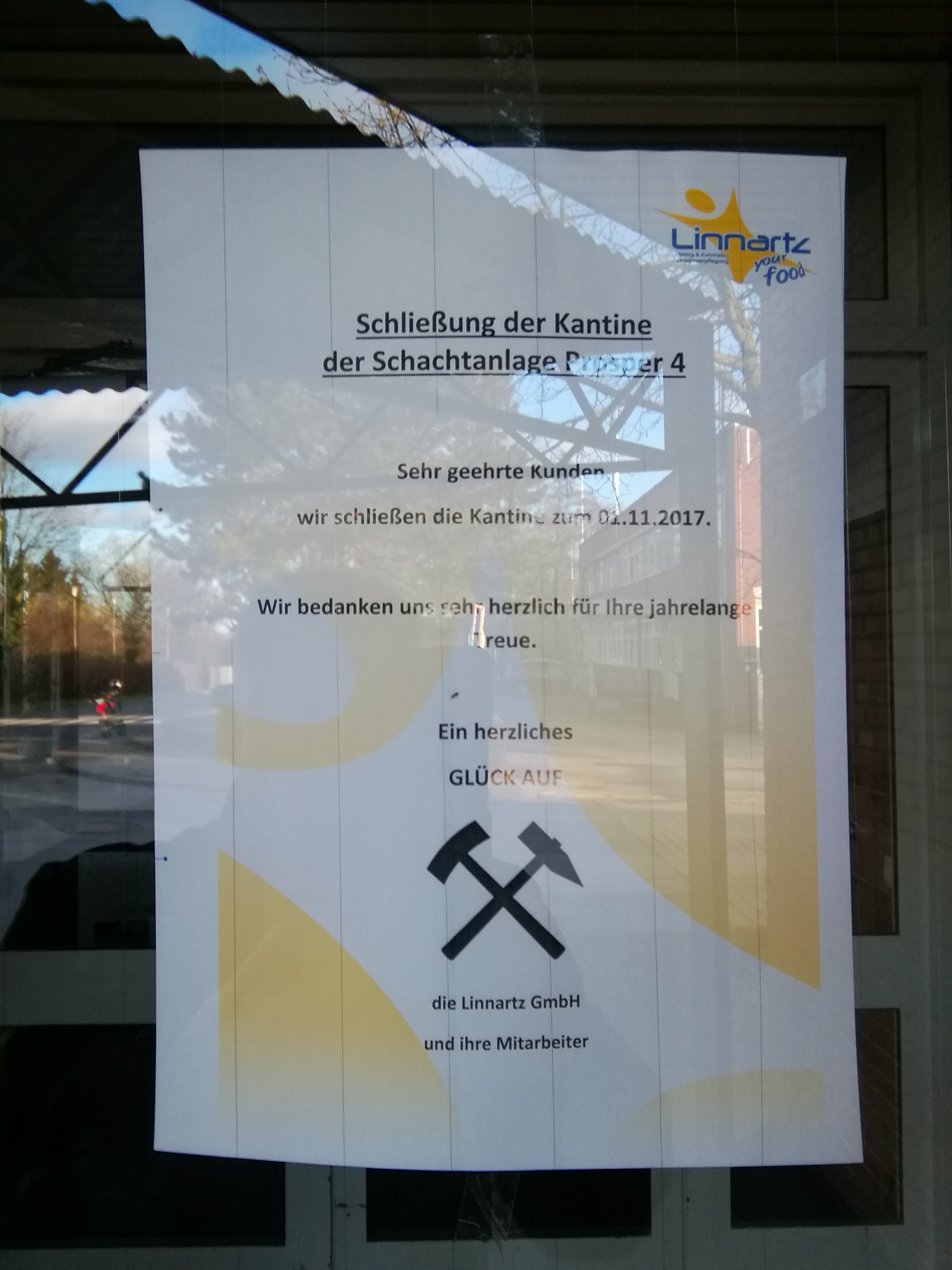 Ich möchte Euch allen mitteilen, dass auf der Nebenschachtanlage Prosper IV Schacht 9 Bottrop - Grafenwald dort seit dem 01.11.2017 die Kantine offiezell geschlossen hat und somit die Bergleute sich nur noch auf Prosper V Schacht 10 umziehen ! Die Kaue sowie die Nebengebäude, werden im Innern ab sofort zurück gebaut.