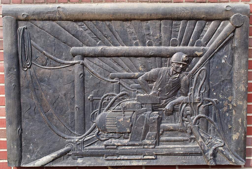 Mittleres von drei Bergbau-Reliefs vor dem ehemaligen Knappenwohnheim der "Mansfeld Bergknappen" (heute Außenstelle Kreisverwaltung) in der "Alten Promenade" in Sangerhausen. Künstler und Entstehungszeit (Das Heim wurde 1976 erbaut?) mir unbekannt.