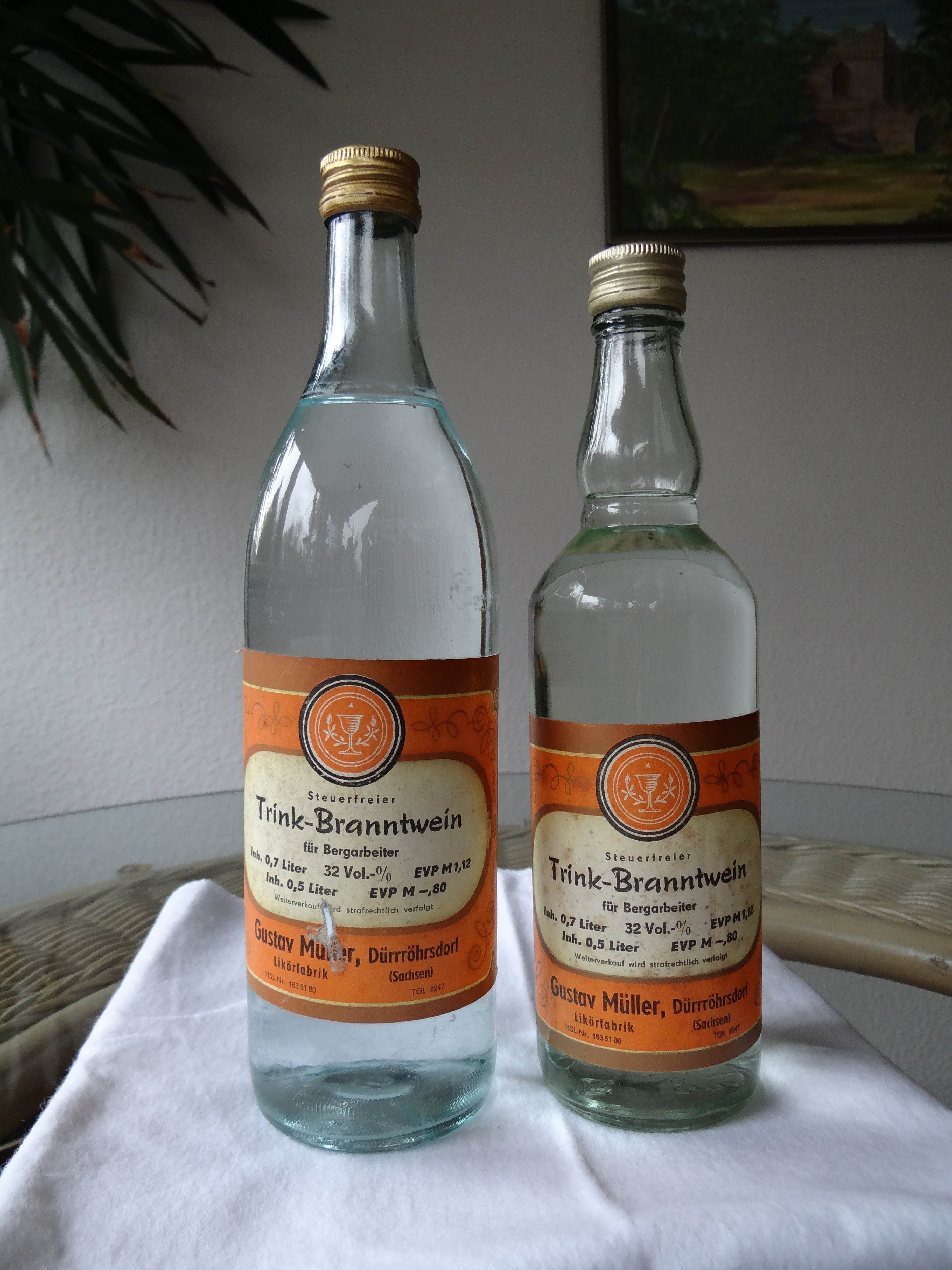 Hier noch eine 1-Liter-Flasche des VEB Weinbrennerei Meerane aus dem Jahr 1956.