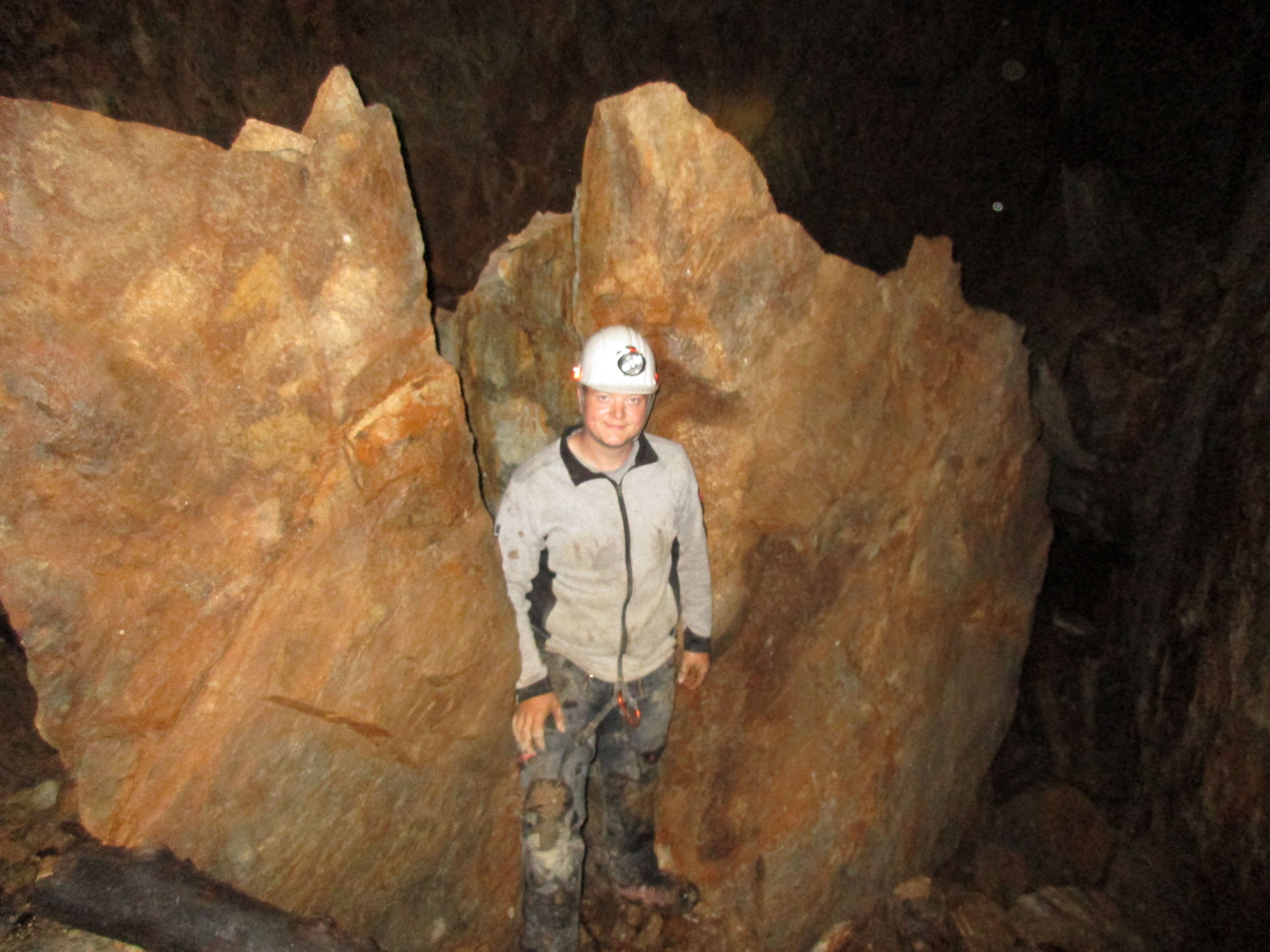 Wir haben uns das Grubengebäude angeschaut und mussten feststellen, dass die Bude sehr instabil ist. Geborstene Hölzer liegen überall rum und riesge Gesteinsbrocken liegen auf der Sohle ( Sohle oder Nachfall ? ). Es macht keinen Sinn, dort irgendwie Mineralien zu bergen, denn man muss am Seil wieder hoch.