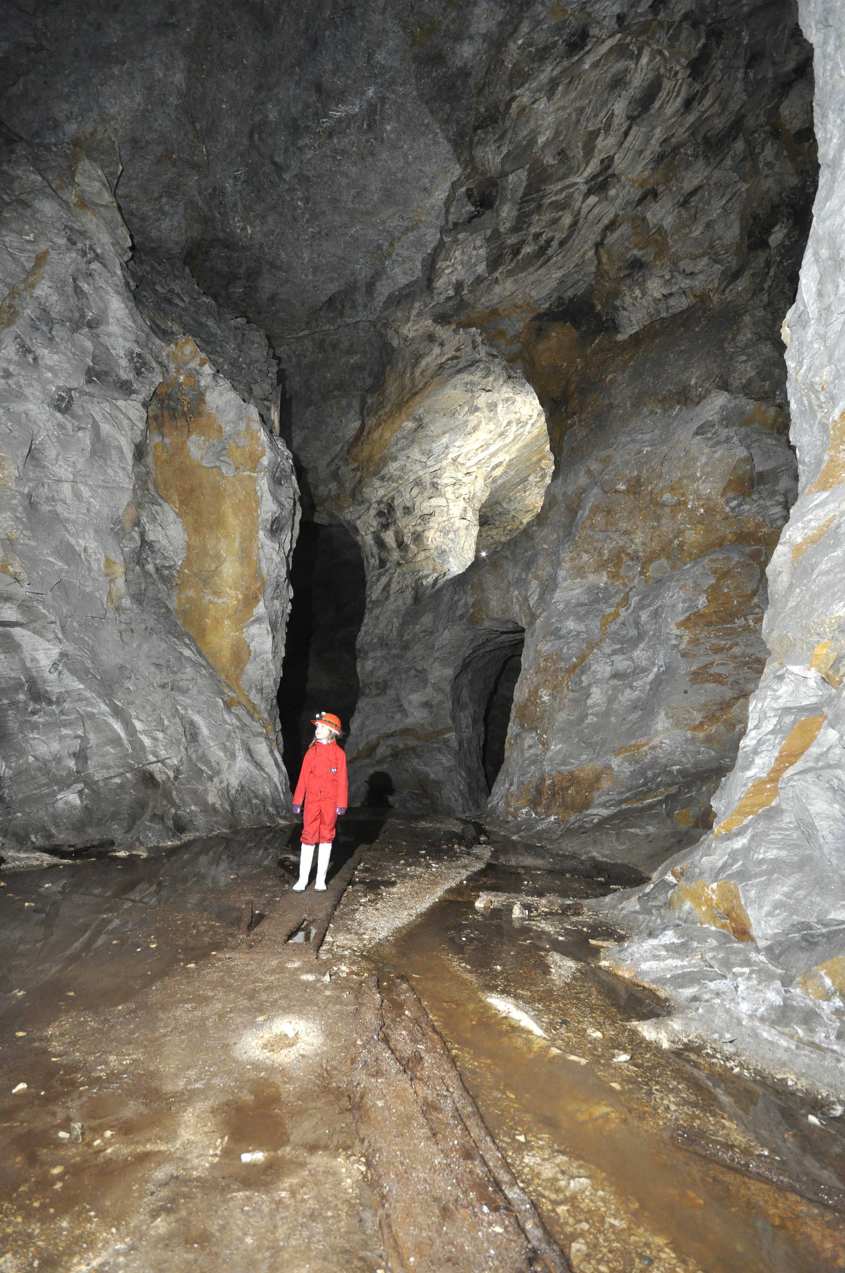 Schieferabbau untertage ist normalerweise farblich eher unspektakulär. Aber hier sorgt ein steter mineralhaltiger Wasserfall aus einer höher gelegenen Abbaukammer für leuchtende Versinterungen sowohl an der Abbauwand, als auch auf dem Grund des künstlichen Sees. Die Reflektion des Lichtes an den schneeweissen Ablagerungen unter der Wasseroberfläche ist die Ursache für das leuchtende Blau des Wassers.