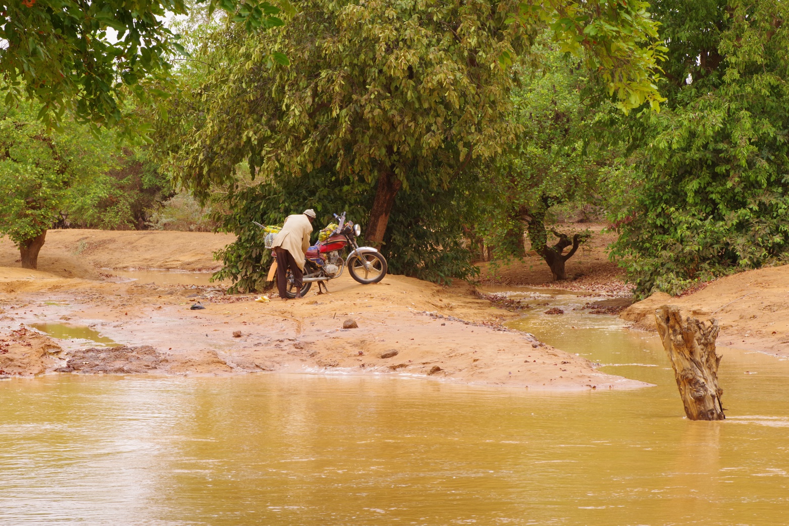 Es gab auch ein paar beeindruckende Staubstuerme, erinnerte das alles etwas an Bilder vom Mars. Nach den Rege ging es fuer uns typischerweise am Fluss erstmal nicht weiter. Auch die lokalen Mangobauern musste auf dem Weg zum Markt am Fluss warten. Uebrigens eines der besten Produkte aus dem Niger - Mango und Ananas. Besser als alles was man bei uns im Supermarkt bekommt. Saftig und die Ananas kein bisschen holzig.