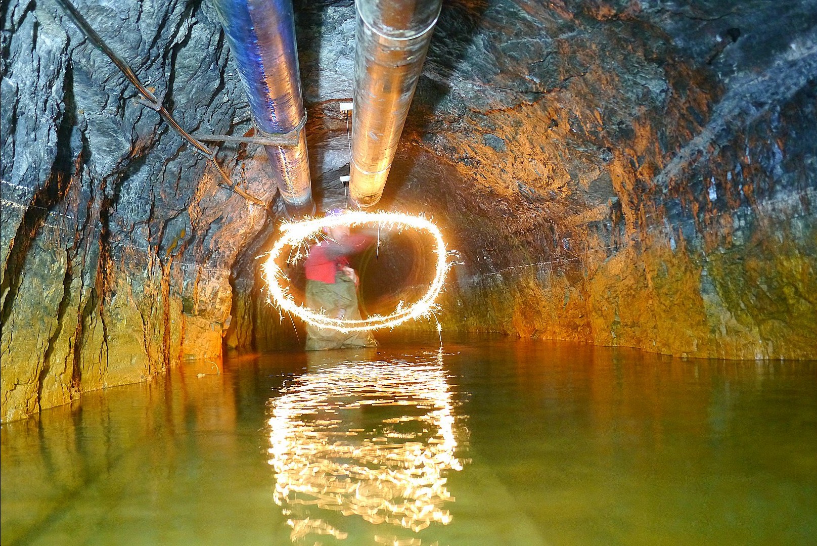 Wetterstrecke in einem ehemaligen Eisenerzbergwerk mit schön übersintertem Stoß und ebenso verziertem Stromverteiler.