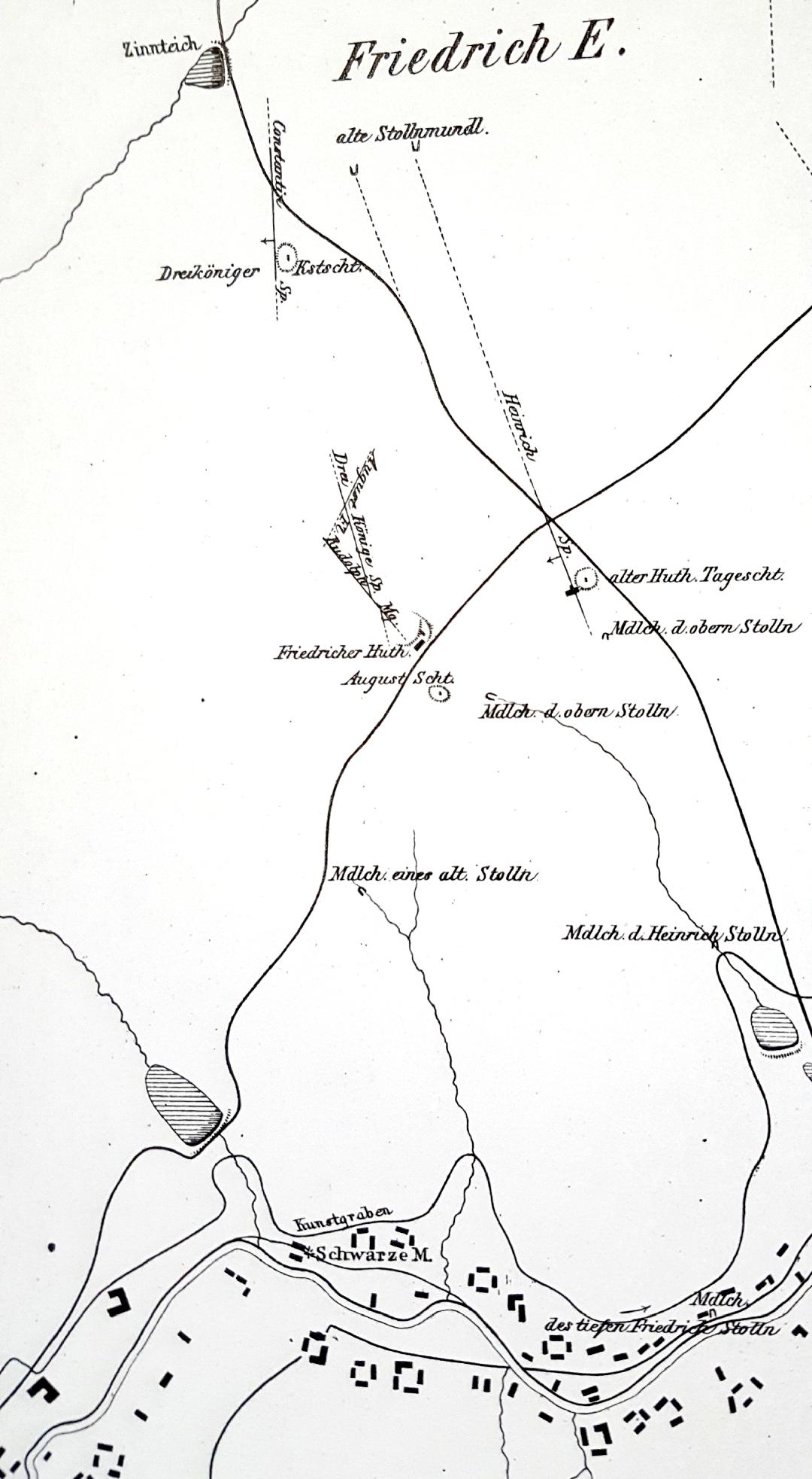 Im Bereich der Häuser Juchhöh 3 und 4 setzen der Rudolph Morgengang und der Drei Könige Spat auf. Ein wenig oberhalb streicht noch der August Flache. Die 3 Gänge wurden in einer 2. Periode als Friedrich Erbstolln bebaut. Das Haus Nr. 4 ist das Huthaus. Oberhalb des Gebäudes muß auch ein Schacht gewesen sein, denn dort befindet sich auch eine Halde. Auf der rechten Straßenseite befindet sich der August Schacht. Dazu könnte das dort befindliche Gebäude passen. Die erste Halde unterhalb auf dem Feld (360 m von der Straße), ist das Mundloch des oberen Stollns.