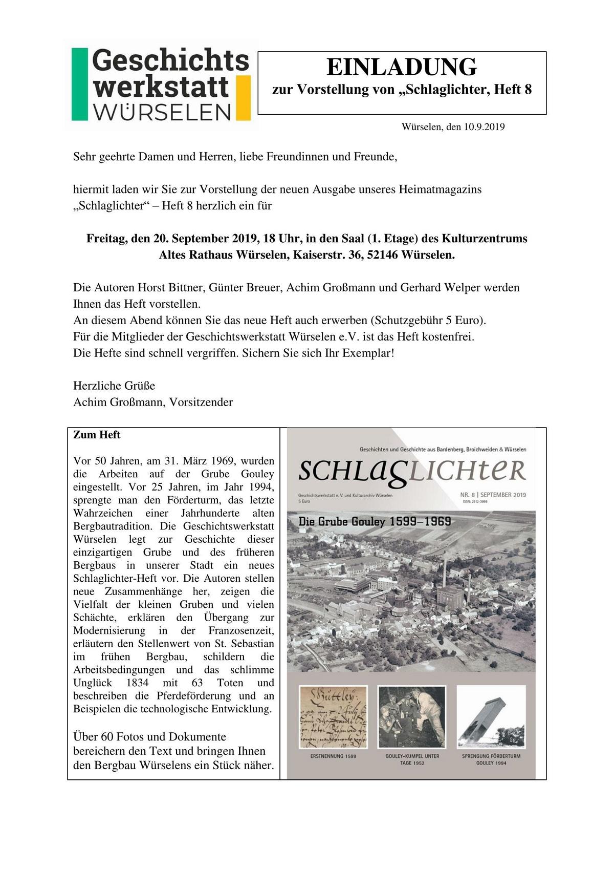 50 Jahre nach der Stilllegung der Anthrazitgrube Gouley in Würselen im Aachener Wurmrevier erinnert die Geschichtswerkstatt Würselen mit dem Heimatmagazin "Schlaglichter" Nr. 8 an das geschichtsträchtige Verbundbergwerk Gouley. Das Autorenteam Horst Bittner, Günter Breuer, Achim Großmann und Gerhard Welper haben dazu mehrere tausend Akten und viele Fotos gesichtet und aufgearbeitet.