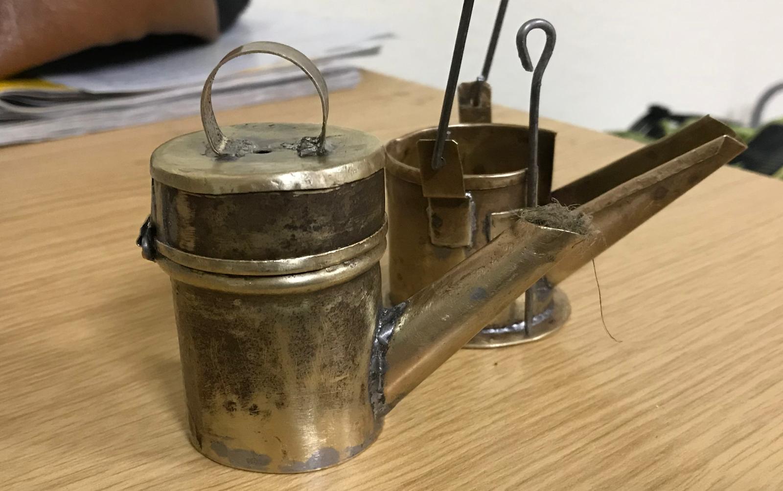 Ich danke dir für dein Lob. Vielleicht hast du ja mitbekommen das wir experimentell den Abbau aus dem Jahre 1885 nachgestellt haben. Was uns allen auffiel, ist wenn die Lampe nicht voll mit Hanf ist tropft das Öl beim fortbewegen extrem raus. Das Öl wird zu einen Teil in der unteren Schale aufgefangen zum anderen landet es als kleiner brennender Tropfen auf der Erde. Ist die Lampe voll mit Hanf und bis zur hälfte mit Öl gefüllt ( die hatten bestimmt nie eine volle Lampe ) passiert nichts. Ich weiss das es von diesen noch Größere im Original gab sie dienten als Streckenlampen und sind sehr selten.