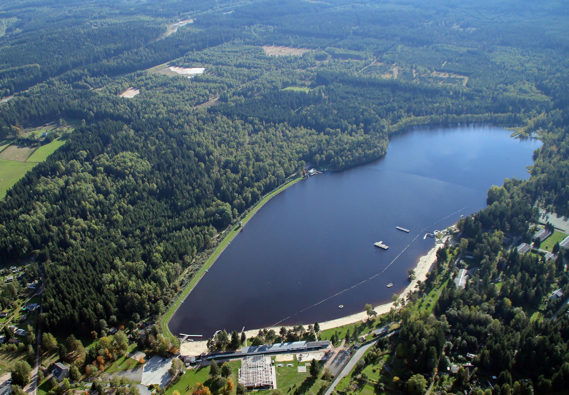 Von dem einstigen Dorf Geamana schaut noch das Dach des Kirchturms heraus, ziemlich in der Bildmitte links im vorderen Tei des See zu sehen .