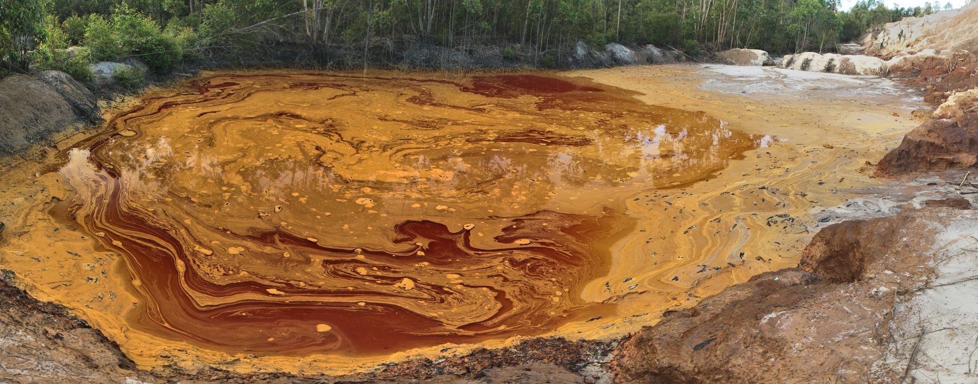 Saures Grubenwasser mit pH ≈ 2 am Fuß von Aufbereitungsabgängen des ehemaligen Goldbergwerks Nestor bei Sabie in Mpumalanga, Südafrika.