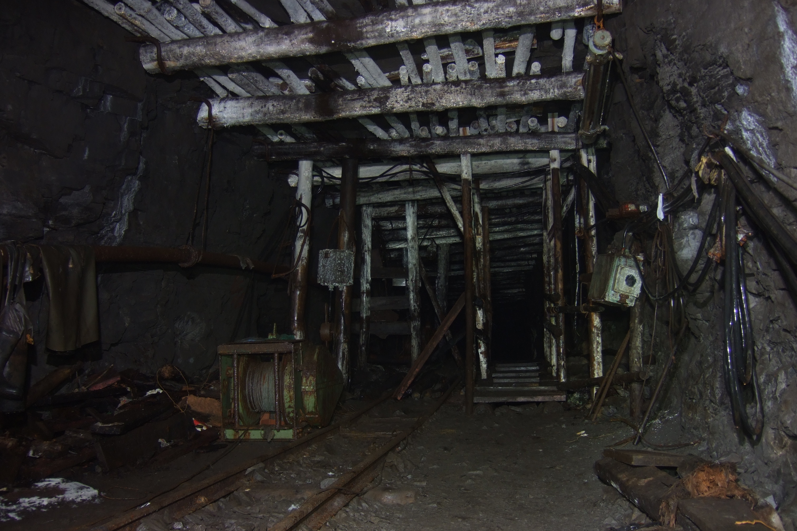 Alter Wismutbergbau im Erzgebirge. Analogphotos sind halt nicht so schön, an der Stelle aber nicht mehr wiederholbar. Türstockausbau im Erzgang mit durchgeschossener Sohle und Erzrolle.