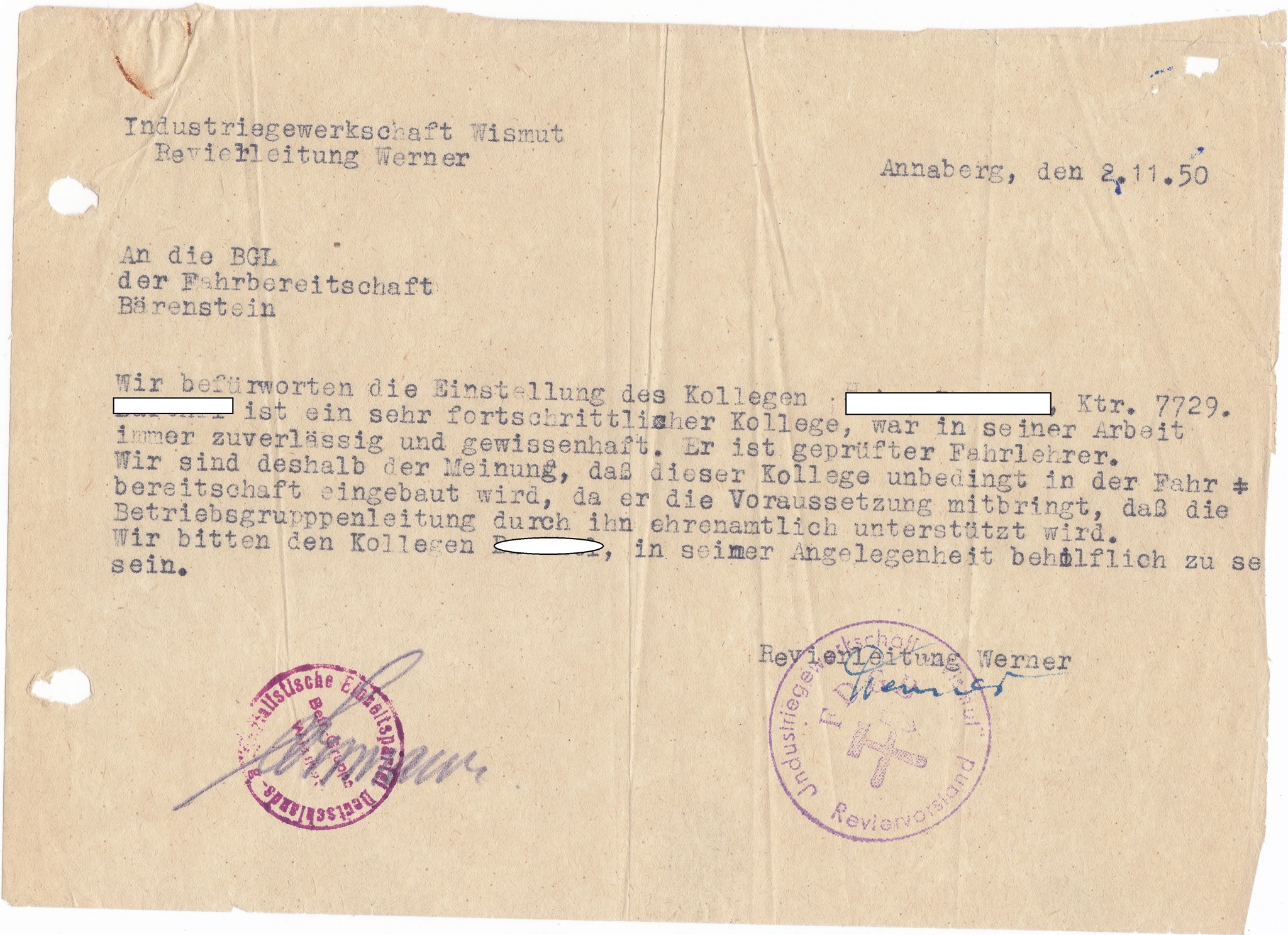 Das Objekt 13 war das Annaberger Ausrichtungsobjekt und bestand bis 1950 fort, um kapitale Grubenbaue zu errichten. Hier wurde scheinbar eine Gewerkschafter ein Empfehlungsschreiben ausgestellt. Wir wissen von Massenentlassungen in den Objekten 4 und 13 einhergehend mit der Konsolidierung von Schachtverwaltungen und Objekten. Die Fahrbereitschaft des Objekt 7 brauchte Kratfahrer, wie wir lesen.