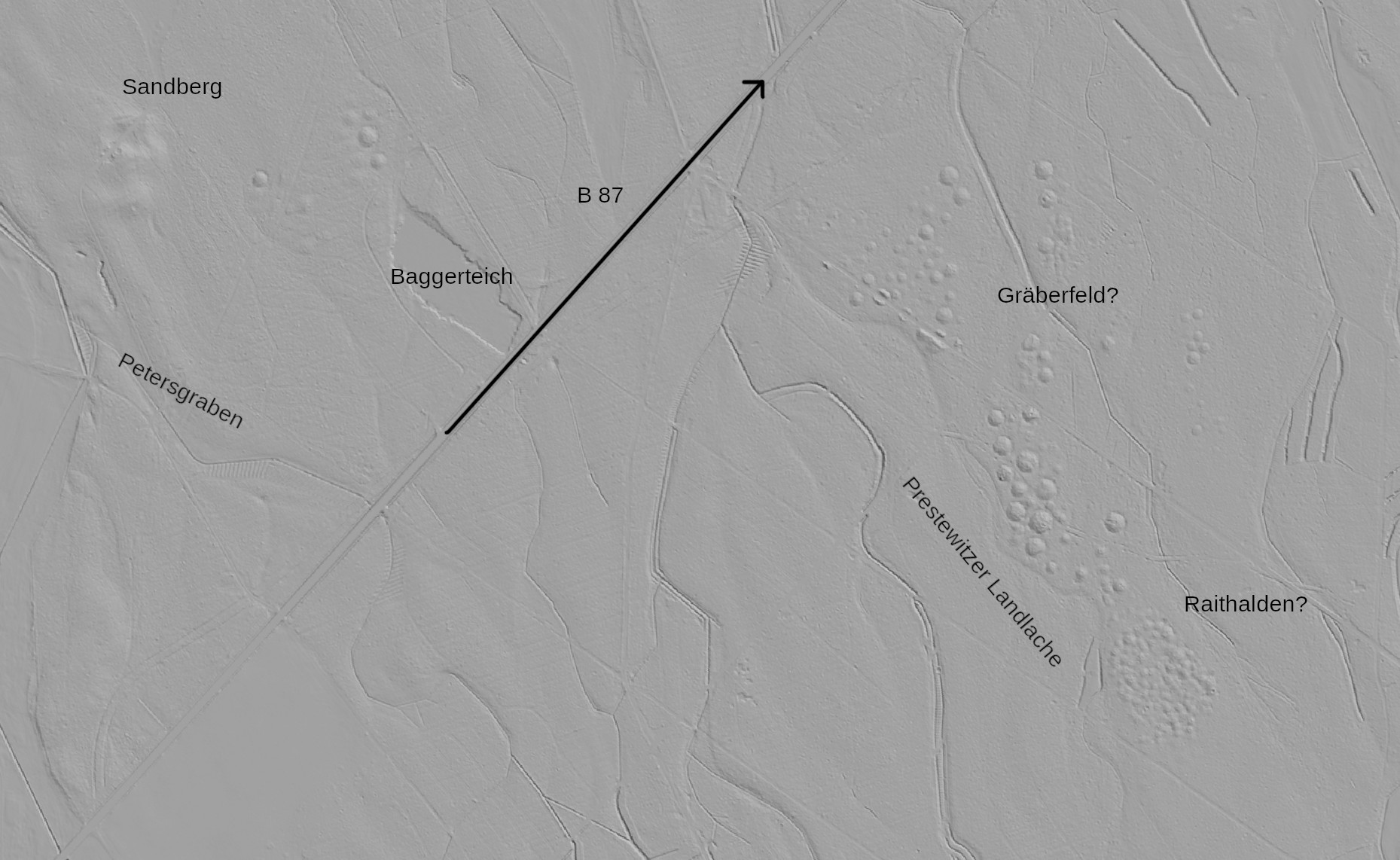 Sorry für den Doppelpost, hier mein Versuch, den Sandberg zu lokalisieren und die Strukturen, die im DGM zu erkennen sind, zu erklären. Gleich vorweg, die folgenden Punkte stützen sich nur auf das DGM und die Georeferenzierung alter Landkarten. Um die Richtigkeit zu überprüfen, ist auf jeden Fall eine Geländebegehung erforderlich.