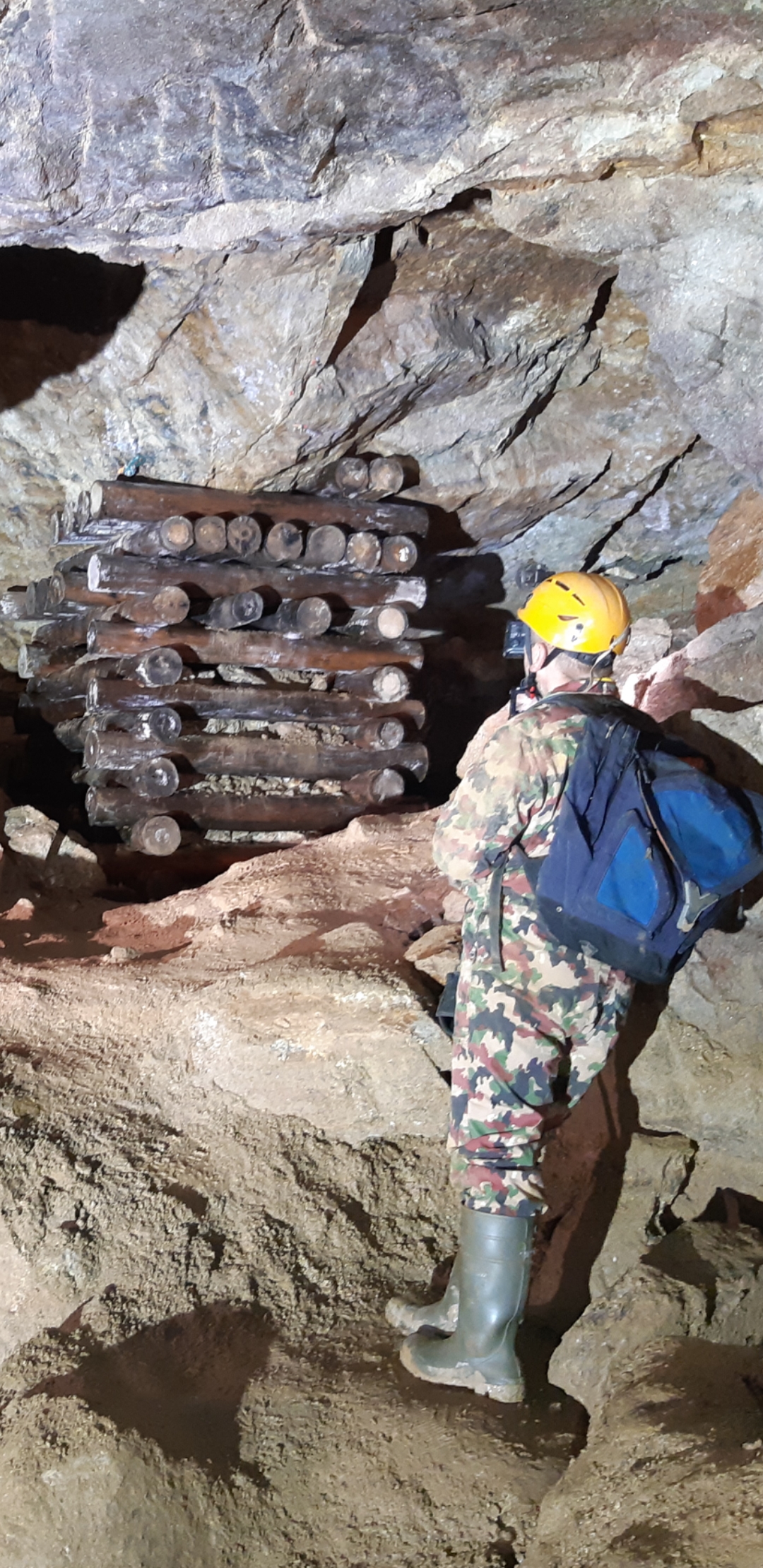 Verwahrungsarbeiten im Schacht 208 in Schlema... Blick von der Schieberkammer Niveau MSS Richtung Rasenbank. Oben ist der Teilaufbau der späteren Betonier- und Arbeitsbühne zu sehen. Stand Oktober 2020.