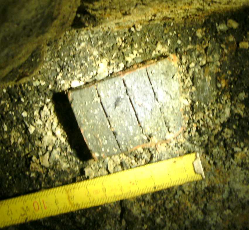 Auf einem Absatz im Liegenden des Schachtes in der Grundstrecke lag etwas, was im ersten Augenblick wie ein Stück Keramik ausschaute. Das Material war aber eher wie frischer Ton/Lehm, also nicht gebrannt. Es war auf der Oberseite schwarz, der Rest war ziegelrot. Auf der Oberfläche waren parallele Linien zu erkennen, die dort hineingeritzt worden sind.