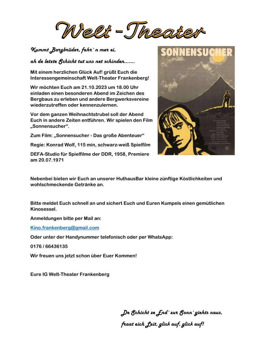 Wäre doch mal eine gute Idee den Kinoverein in Frankenberg zu unterstützen. Und wann sieht man mal diesen Film auf Kinoleinwand ... Glück auf!