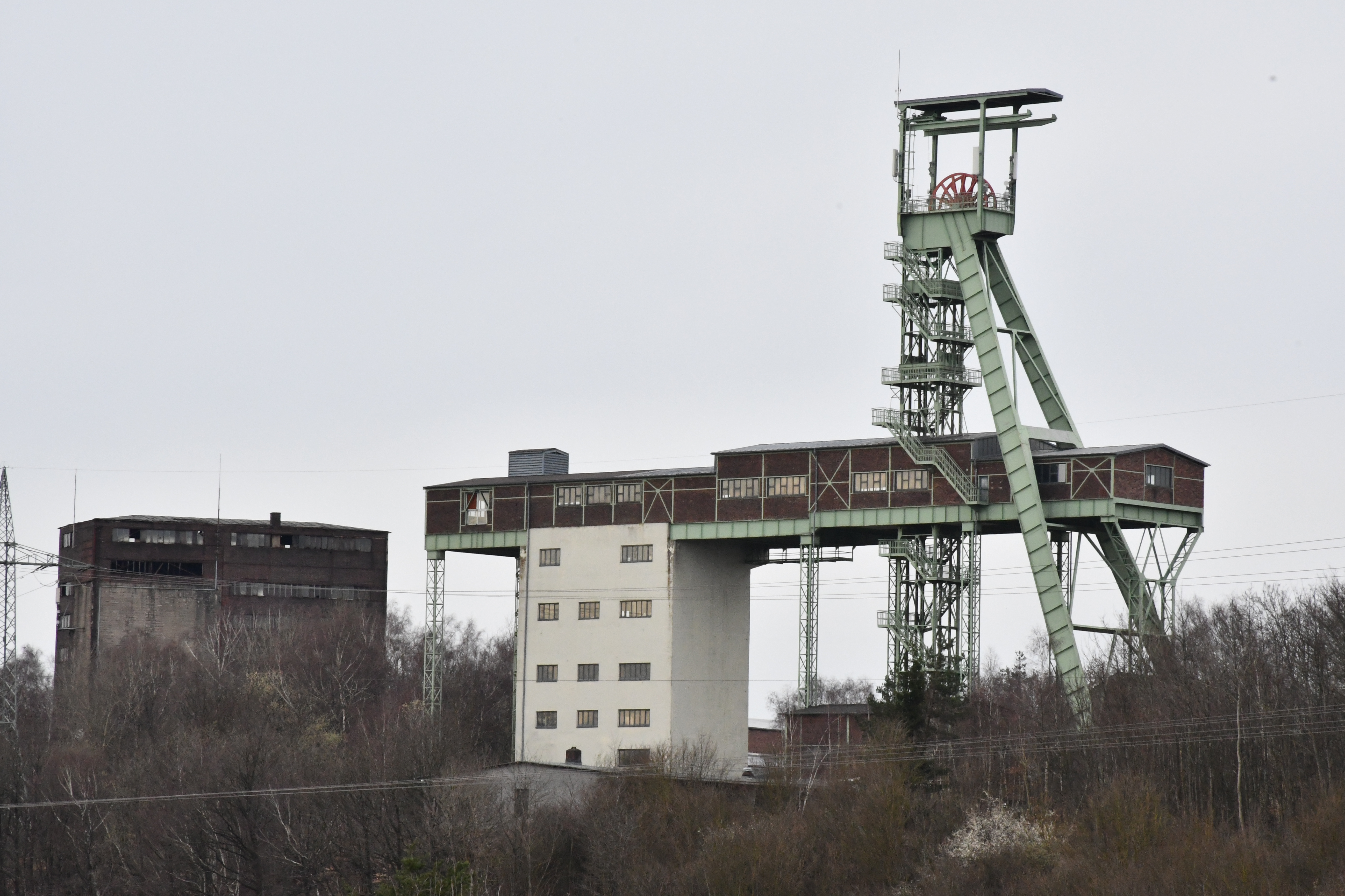 Links der erhaltene Aufbereitungsturm, dahinter das Fördermaschinen- u. Trafogebäude, rechts Kaue, Schmiede und Garagen.