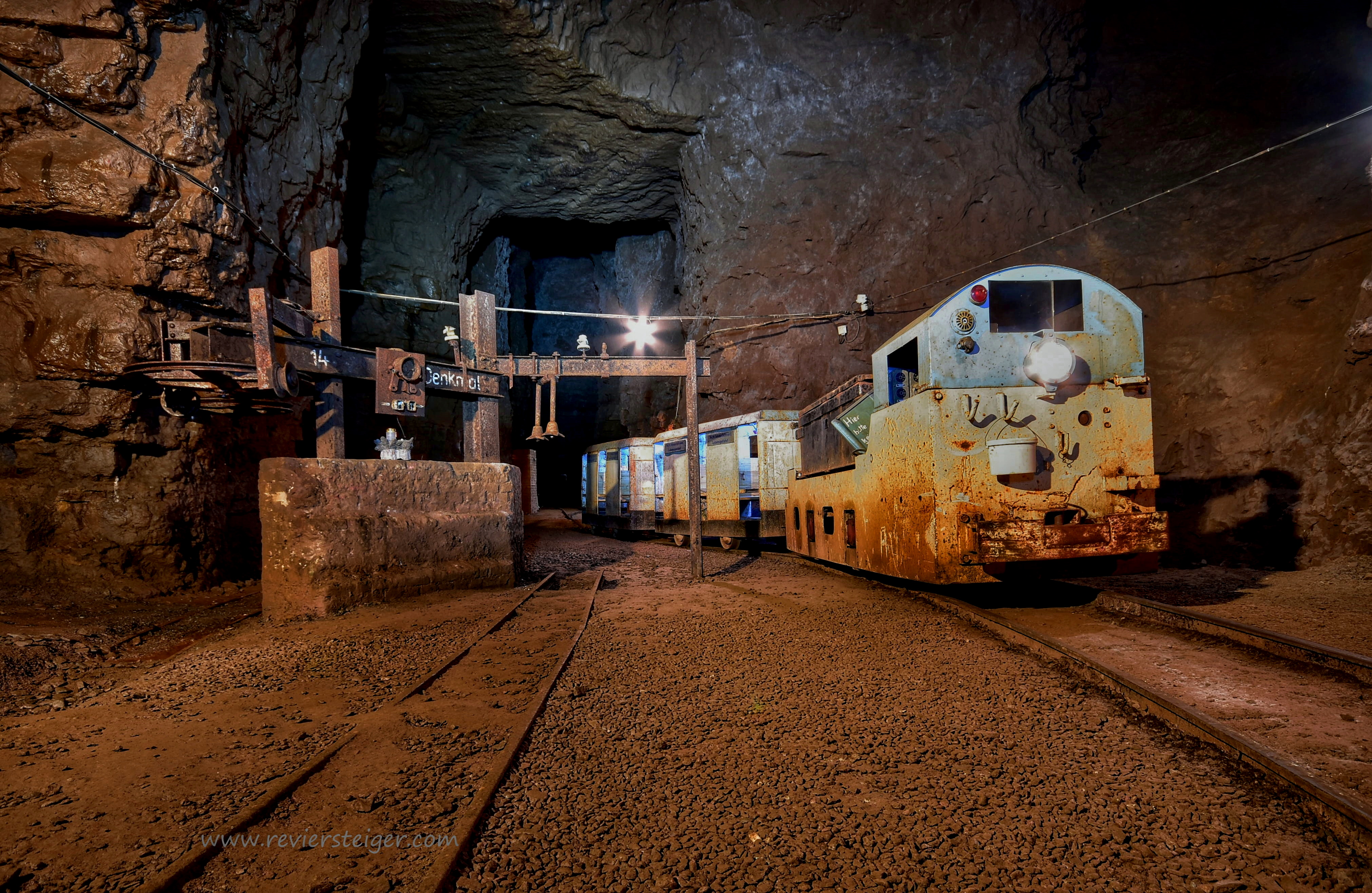 Ehemalige Seilbahnumlenkstation und Besucherzug (Lok ex Schiefergrube Glückauf/Unterloquitz, eine LEW EL 8 Baujahr 1955 mit der Baunummer 7341 (DANKE URAN!)) in einem der großen Kammerbaue im Besucherteil des früheren Bergwerkes.