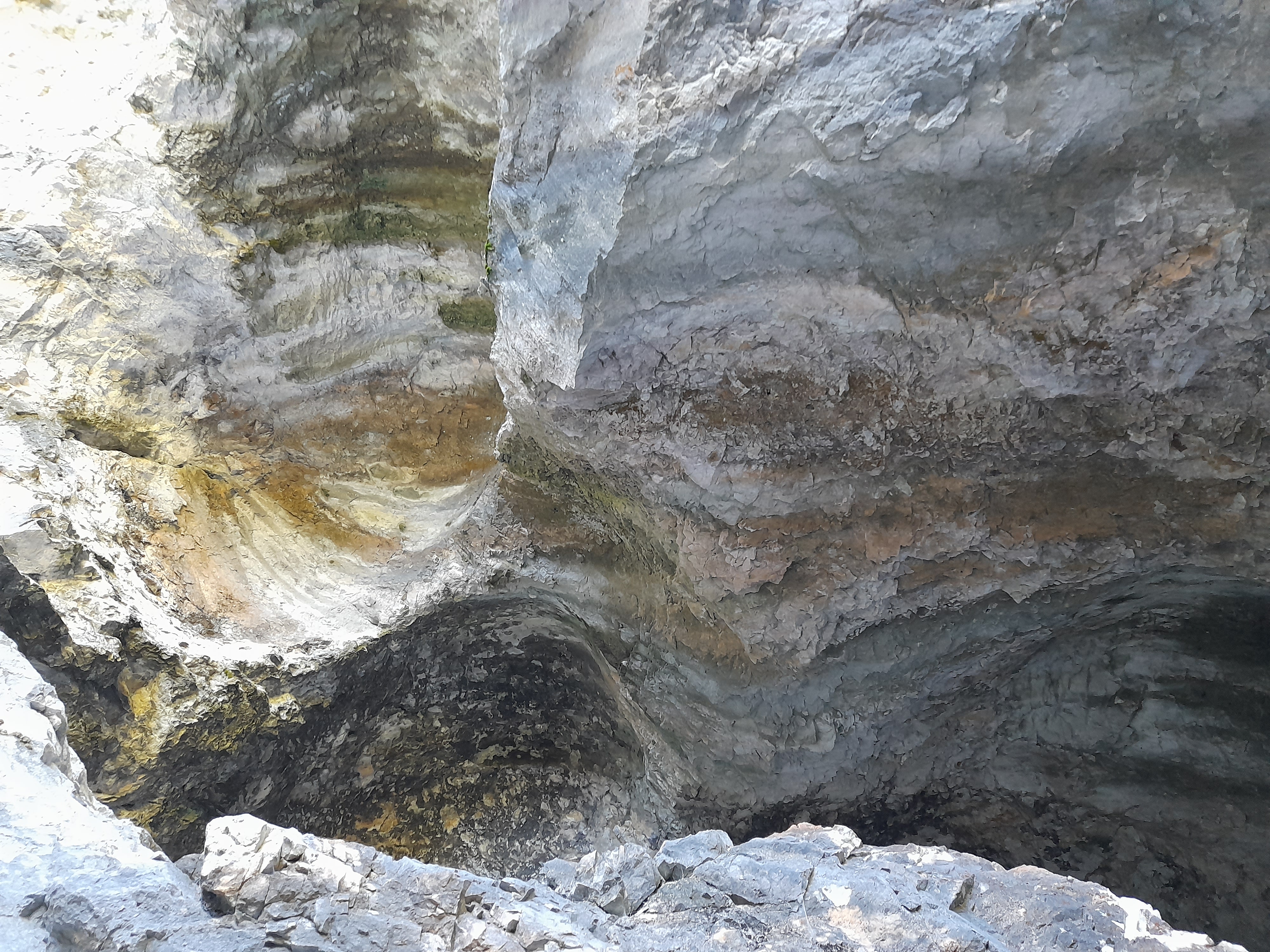 An der anderen Talseite ist die Grubenbahn zu sehen, die in 3 km die Grenze nach Frankreich überquerte. Von dort ging das Erz 1000 Höhenmeter mit der Materialseilbahn in das Orle Tal hinunter, dann 10 Km weiter mit einer Tagesförderbahn, durch viele in den Fels geschlagene Tunnel mit Bremsberg am Ende, der zur 450m tiefer gelegen Aufbereitungsanlge führte. Von dort sind wir hochgekommen.