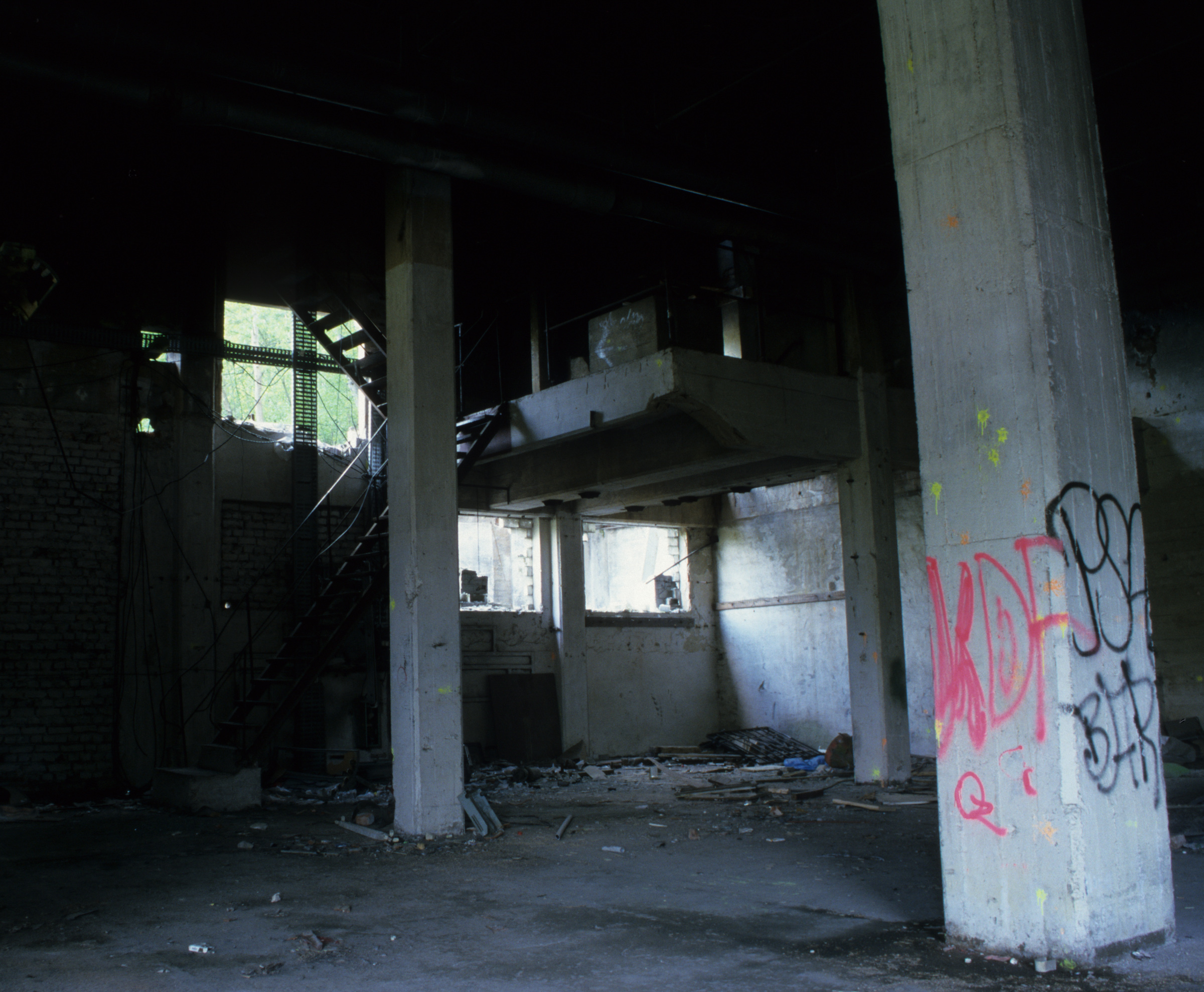 Gebäude der Erzaufbereitung Wolramitgrube Zschorlau Bergsegen 3. 1956 Beendigung der Arbeiten. Foto ist von 2002, inzwischen sind alle Gebäude abgerissen, Fläche ist saniert. (Wald)
