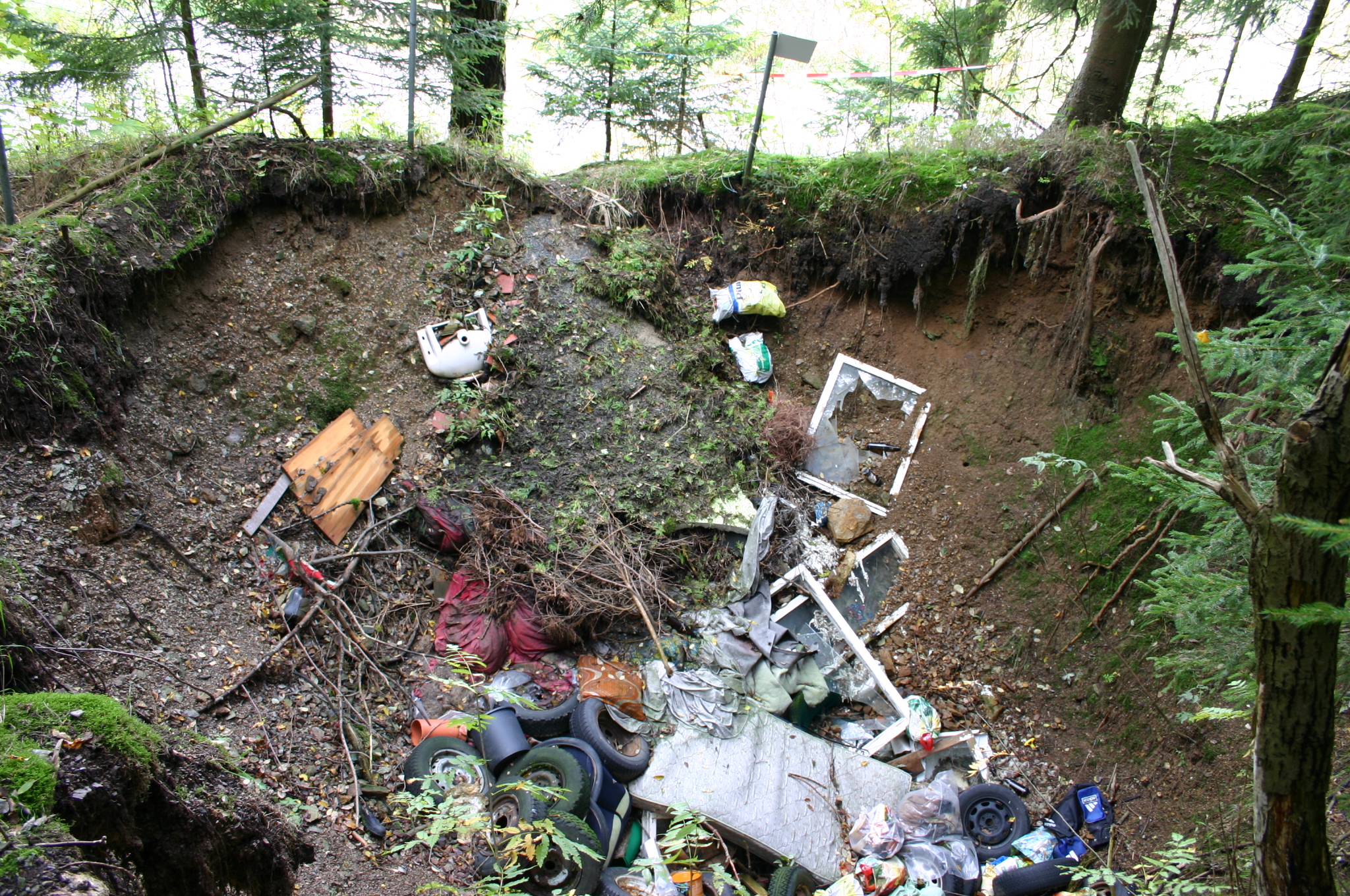 Zustand 2012 im damals noch sichtbaren Schurf 18 der SV 253 SAG Wismut. Der Schurf liegt abseits des Ortes direkt an der Zufahrt zum Breitenbrunner Sauberg. Diese abgeschiedene Lage nutzten unangenehme Zeitgenossen zur Verkippung ihres Mülls.
