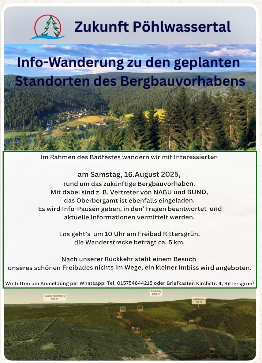 Nach Ansicht des Vereins werden die bekannten Bergbauvorhaben die Region entscheidend prägen. Umso wichtiger sei es, dass etwas dafür getan werde, dass die Kinder und deren Kinder in einer gesunden und schönen Gegend leben können. Jeden zweiten Montag eines Monats bietet der Verein eine Sprechstunde an. Die findet von 17 bis 18 Uhr im Vereinszimmer in der Turnhalle Rittersgrün statt. Darüber hinaus ist der Kontakt über die Homepage www.bi-poehlwassertal.de möglich. (Bildquelle: Michael Burkhardt)