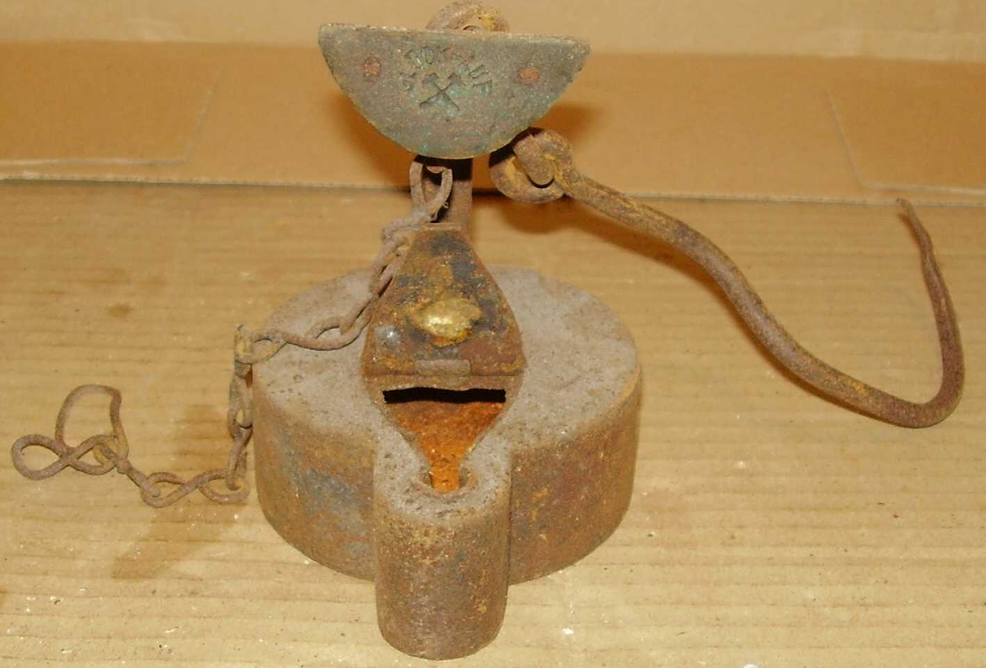 Ansonsten ist er gut erhalten, ob die Kette original ist oder mal getauscht wurde, entzieht sich meiner Kenntnis, paßt aber aufgrund der Patina zum Rest. Der Stocher war wie ein U verbogen, den habe ich ganz sachte gerichtet. Vorsichtig gereinigt und das Messingschild vom Grünspan befreit und so bleibt er.