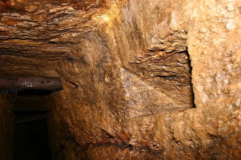 ist es absolut unwahrscheinlich das eine Art von Holz-, Stahl- oder Natursteinausbau geplant war, da dies bedingt durch die geologische Situation nicht nötig ist und es gibt keine weiteren Hinweise darauf (Holzreste, Gegenloch usw.) Siehe Bild Bühnlöcher für ausreichend von der typischen Form, wie sie die meisten von uns kennen.