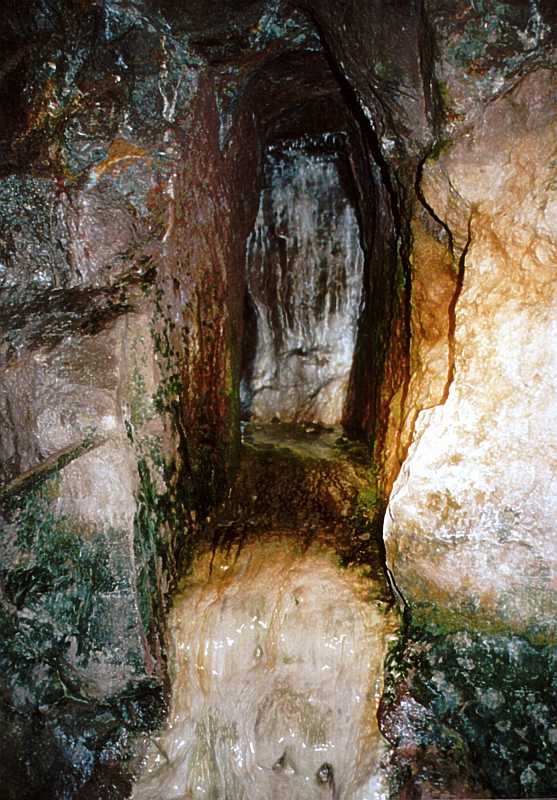 Suchort mit Kalksinter im Besucherbergwerk Fischbach/Nahe